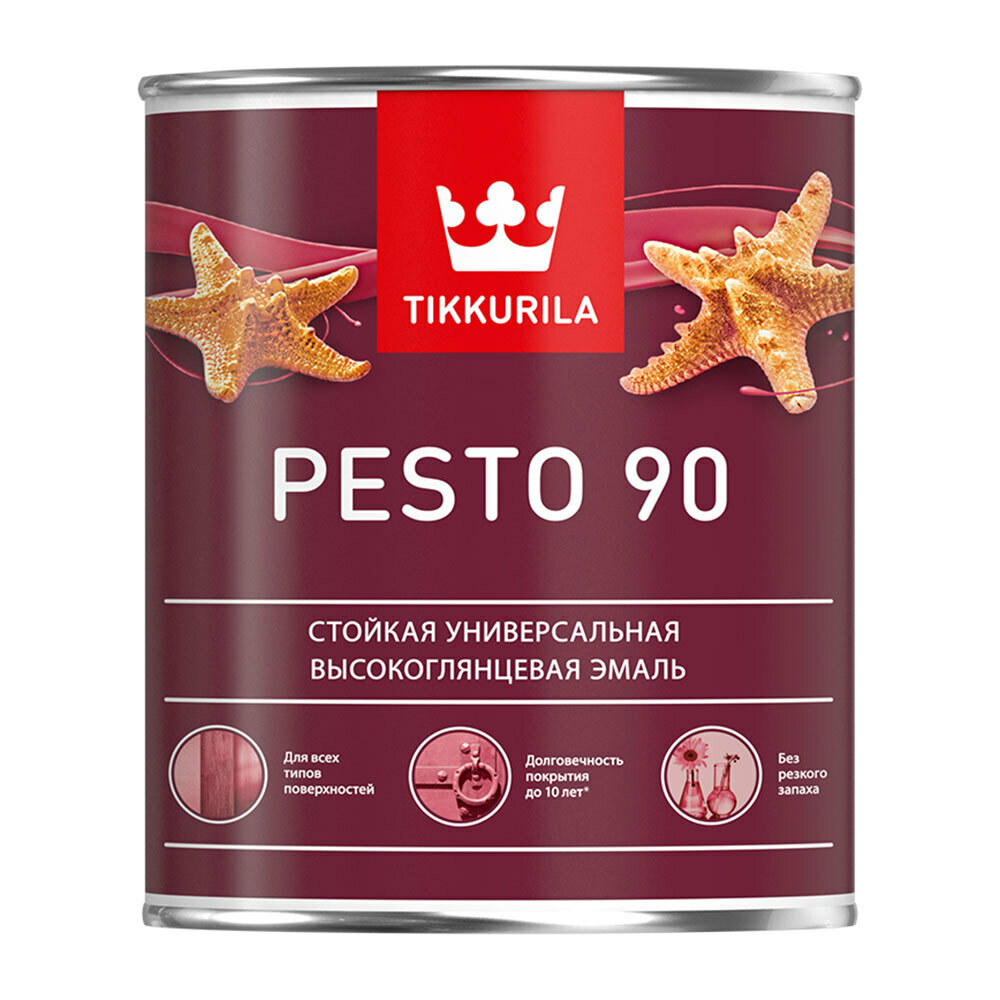 **Эмаль универсальная стойкая Tikkurila Pesto 90** редназначена для окраски деревянных, древесностружечных, древесноволокнистых и металлических поверхностей внутри и снаружи помещений (оконных рам, дверей, мебели и т.п.), а также оштукатуренных, бетонных, зашпатлеванных, кирпичных, гипсовых поверхностей внутри помещений (стен, потолков, окон, дверей, мебели и других поверхностей внутри помещений, требующих частого мытья, например, в ванных, кухнях).