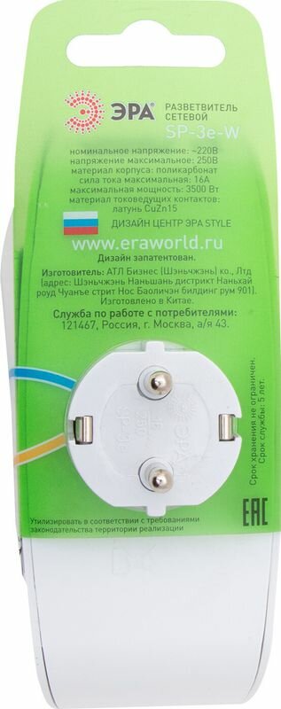 ЭРА – сетевой разветвитель с тремя розетками. Выполнен он из прочного поликарбоната, поэтому обладает высокой устойчивостью к механическим повреждениям. Заземление и защитные шторки, препятствующие попаданию пыли и грязи, делают устройство надёжным и абсолютно безопасным.
