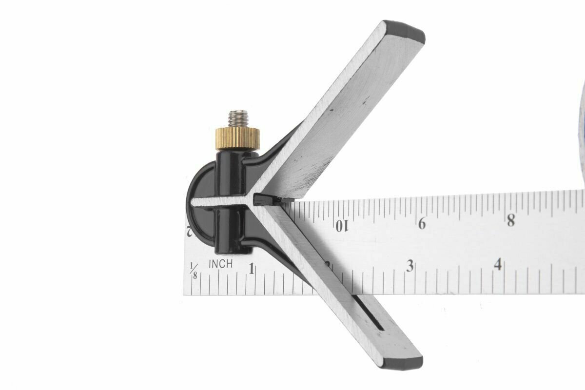 Алюминиевое основание, линейка выполнена из нержавеющей стали с антикоррозийным покрытием, шкала рифленая двухсторонняя. Глазок неповоротный. Угломер свободно перемещается по линейке, позволяет измерять углы до 360 градусов. Предназначен для измерения и разметки углов при столярных работах.