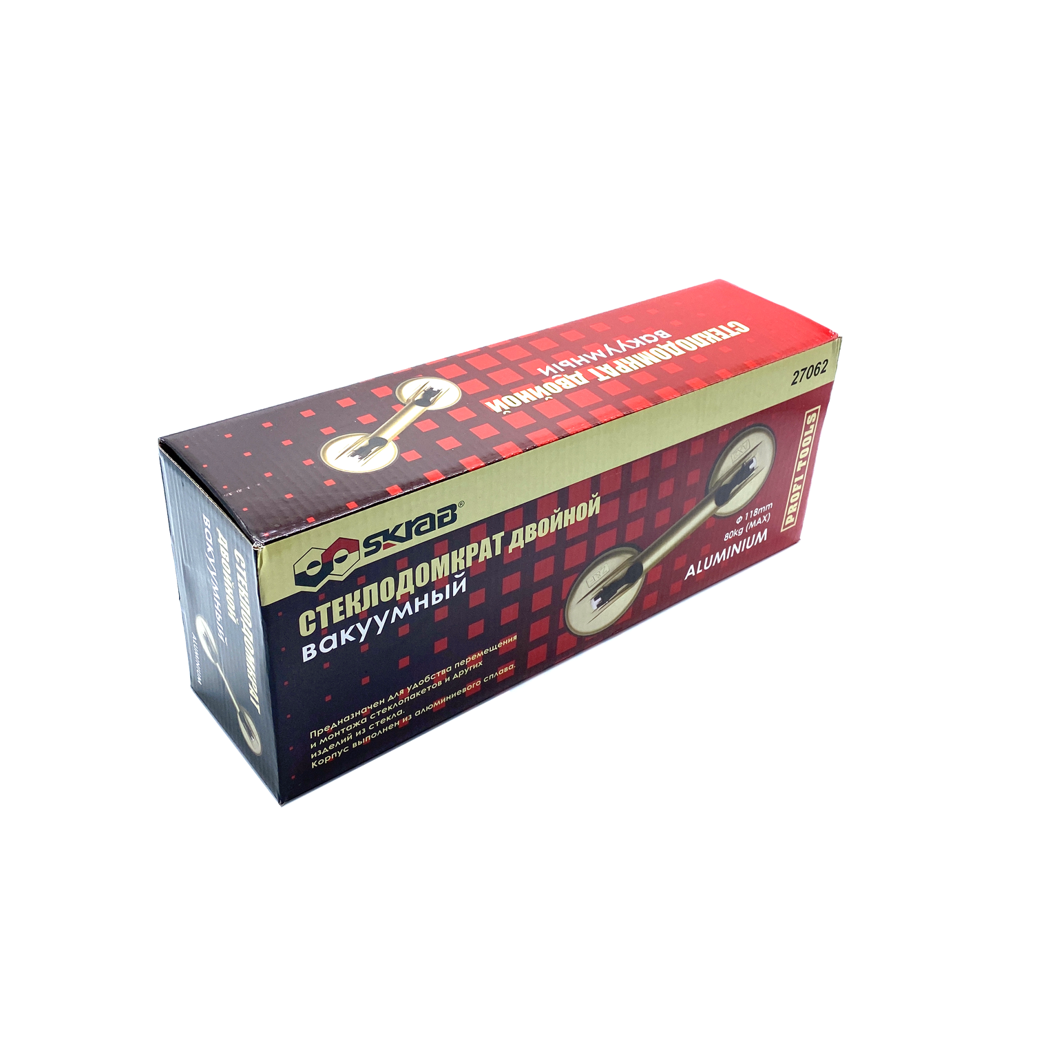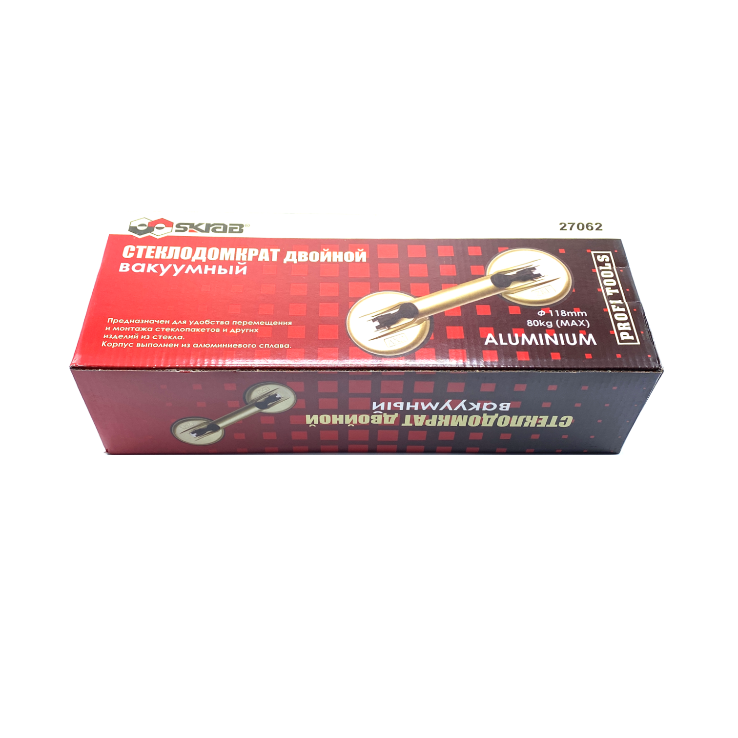 Характеристики двойных стеклодомкратов SKRAB Количество вакуумных присосок 2 шт. Диаметр вакуумных присосок 118 мм Максимальная нагрузка 80 кг Материал корпуса Алюминиевый сплав Производитель SKRAB Артикул Страна изготовитель Китай Оптовая / розничная упаковка 10 / 1 шт. Размеры оптовой упаковки 45,5 х 27,5 х 34 см Вес оптовой упаковки нетто / брутто 7 кг / 9 кг Оптовая цена по запросу Двойные стеклодомкраты SKRAB с алюминиевым корпусом представляют собой 2 вакуумных присоски для стекол, соединенные металлической рукояткой, применяются для переноски, снятия и установки стекол, зеркал, листового металла, кафеля и других предметов с гладкой поверхностью. Вакуумные присоски для стекол SKRAB хорошо зарекомендовали себя блягодаря низкой цене, высокому качеству и надежности при профессиональном применении на заводах, производствах стеклопакетов. Алюминиевые стеклодомкраты SKRAB выдерживает нагрузку более 80 килограмм.