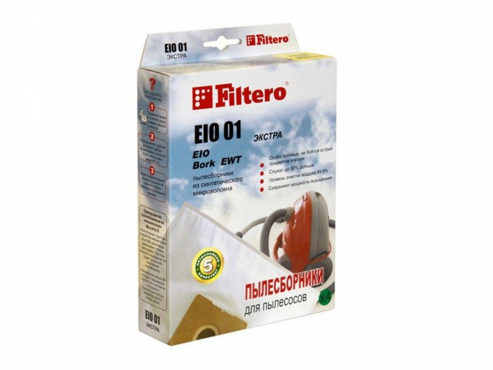 | Прочие особенности и свойства | Набор пылесборников Filtero EIO 01 Экстра — незаменимый аксессуар для традиционных пылесосов с мешком для сбора пыли. Эти мешки изготовлены из синтетического микроволокна MicroFib. Пятислойный материал отличается особой прочностью, устойчив к воздействию влаги, хорошо задерживает пыль. Эти качества обеспечивают хорошую мощность всасывания на протяжении всего срока службы пылесборника. |