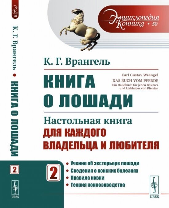 Вниманию читателей предлагается труд видного шведского ипполога Карла Густава Врангеля (1839-1908), содержащий подробный научно-практический курс коневодства и коннозаводства. Настоящее издание, представляющее собой второй том книги, включает учение об экстерьере лошади и краткую теорию коннозаводства. Кроме того, в книге описываются основные лошадиные породы, рассматриваются внутренние и наружные болезни лошадей, главнейшие правила ковки, а также правила содержания и тренировки скаковых лошадей. Первый том книги, содержащий сведения по анатомии и физиологии лошади, правила ухода, а также краткую теорию верховой езды, выходит одновременно со вторым.