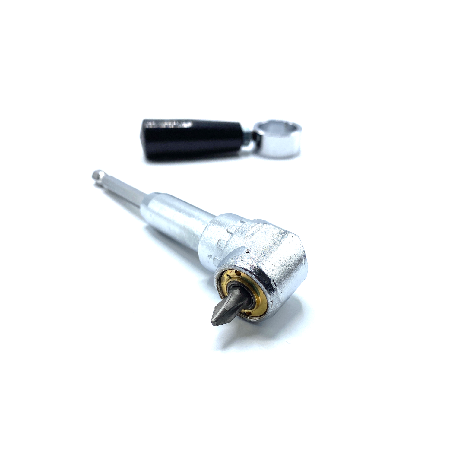 Угловая насадка на дрель или аккумуляторную дрель (шуруповерт). Редуктор изготовлен из хром-ваннадиевой стали, компактен, поворачивается на 360градусов и, таким образом, может быть использован для сверления, вкручивания и выкручивания шурупов в труднодоступных местах. Для удобства работы редуктор угловой оснащен дополнительной поворотной ручкой.
