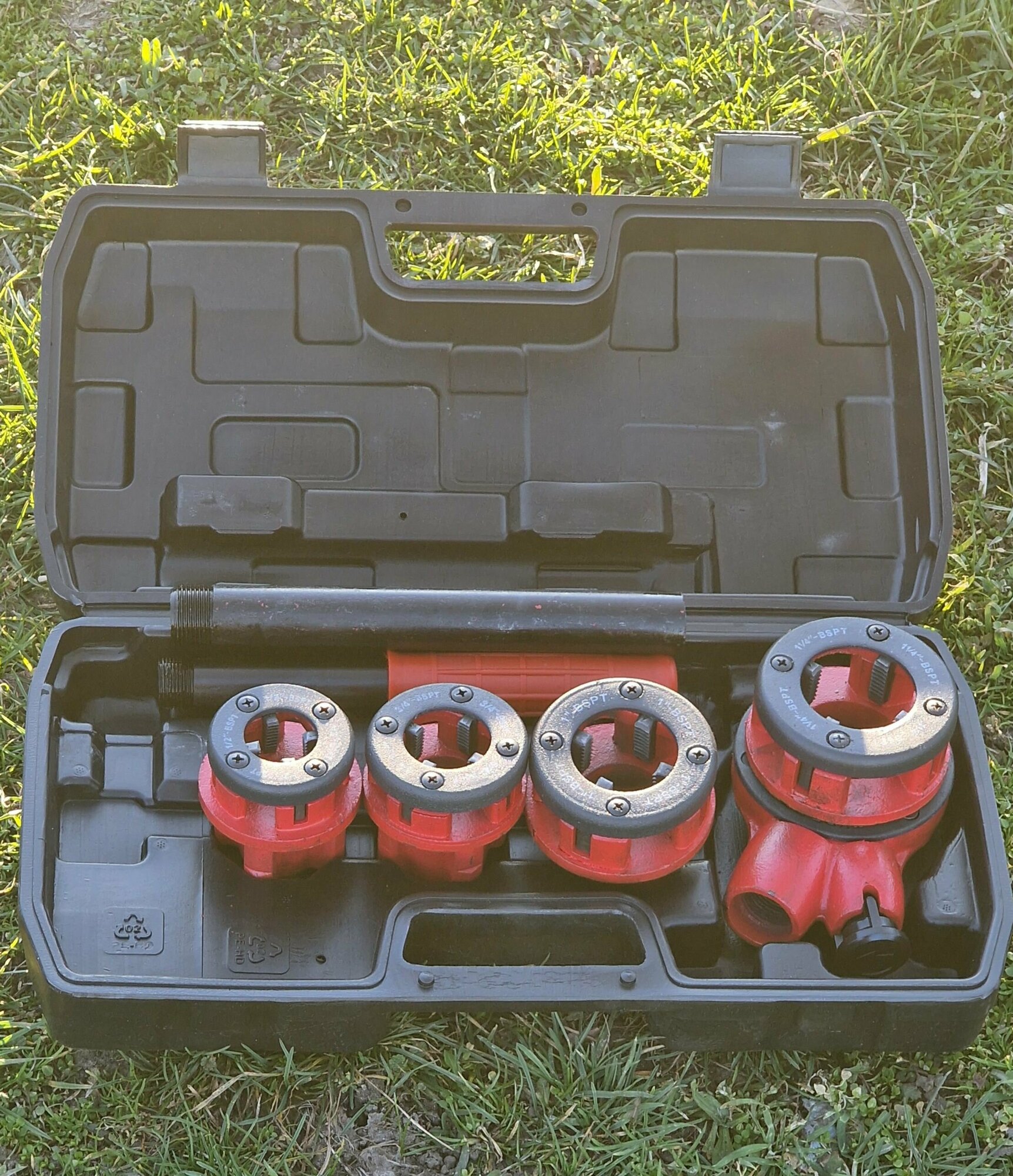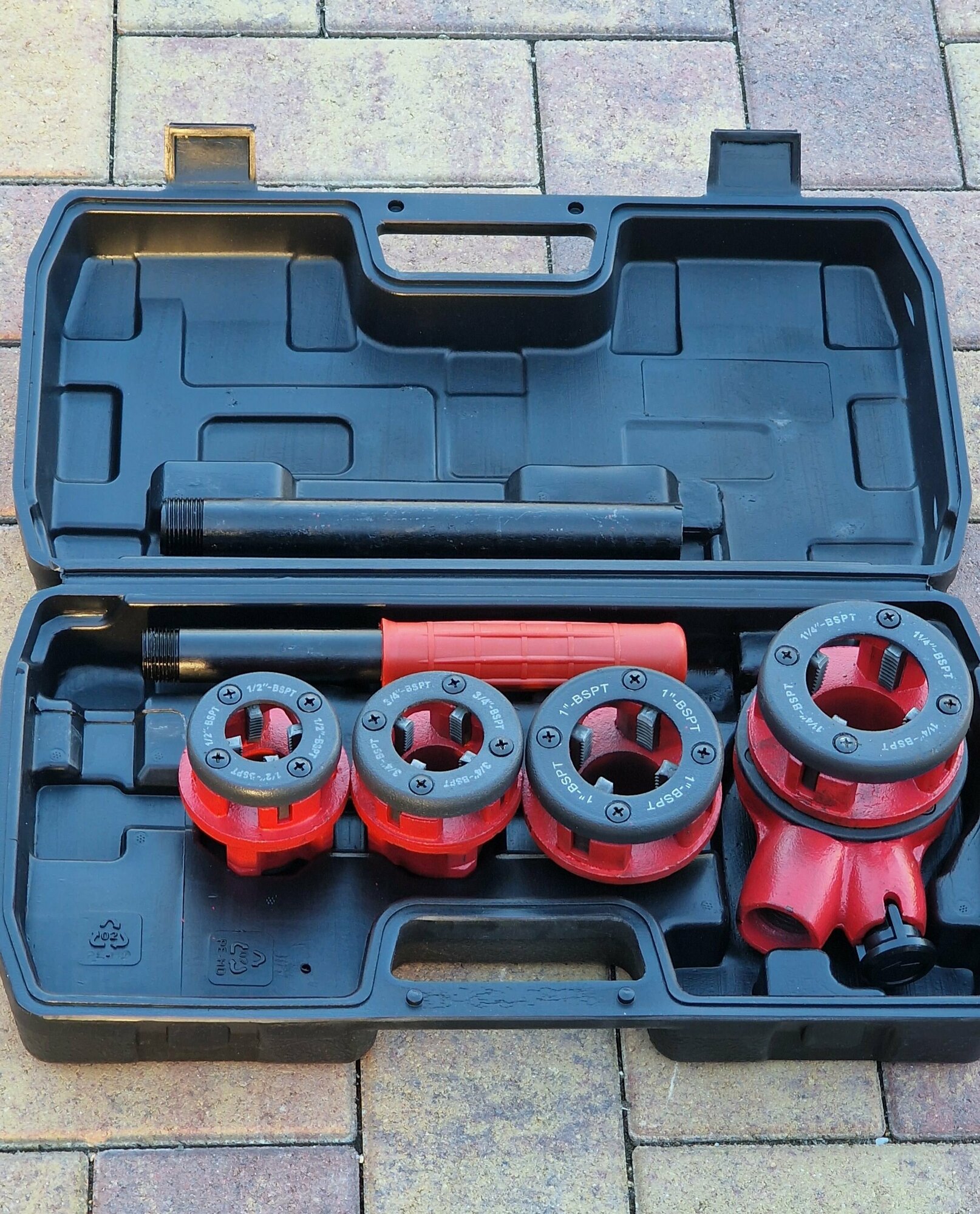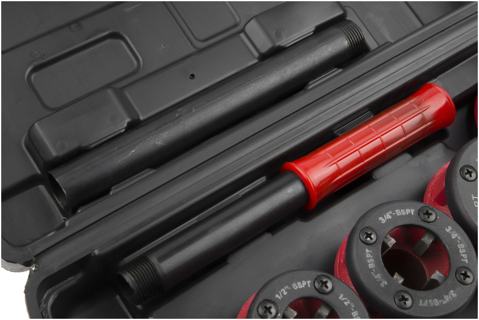 В комплект входят 4 клуппа 1/2", 3/4", 1", 1 1/4" с правой резьбой, универсальная трещотка с ручкой, удлинитель ручки (для увеличения длины рычага), пластиковый кейс. Резцы клуппов изготовлены из закаленной инструментальной стали. Каждый клупп предназначен для нарезки резьбы на деталях одного диаметра. Одна резьбонарезная трещотка подходит ко всем клуппам комплекта. Клуппы обеспечивают точную и быструю нарезку наружной резьбы на металлических трубах. Для увеличения срока службы по окончании работы рекомендуется очищать клуппы и трещотку от стружки и смазывать маслом.