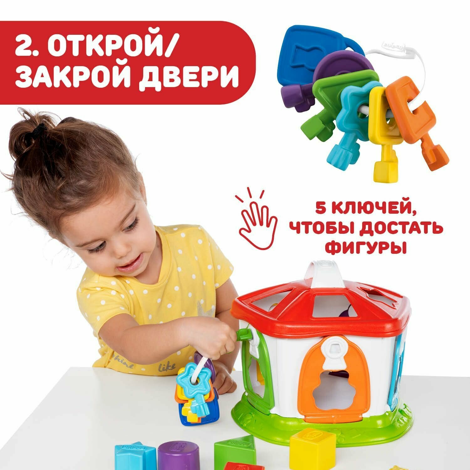 Chicco Геометрические фигуры и фигурки животных должны быть собраны внутрь циркового домика в соответствии с формой и цветом. Каждой дверце соответствует свой ключ, а основной ключ открывает все дверцы Разнообразная и увлекательная игра, которая развивает координацию движений, логическое мышление, а так же учит распознавать формы и цвета.