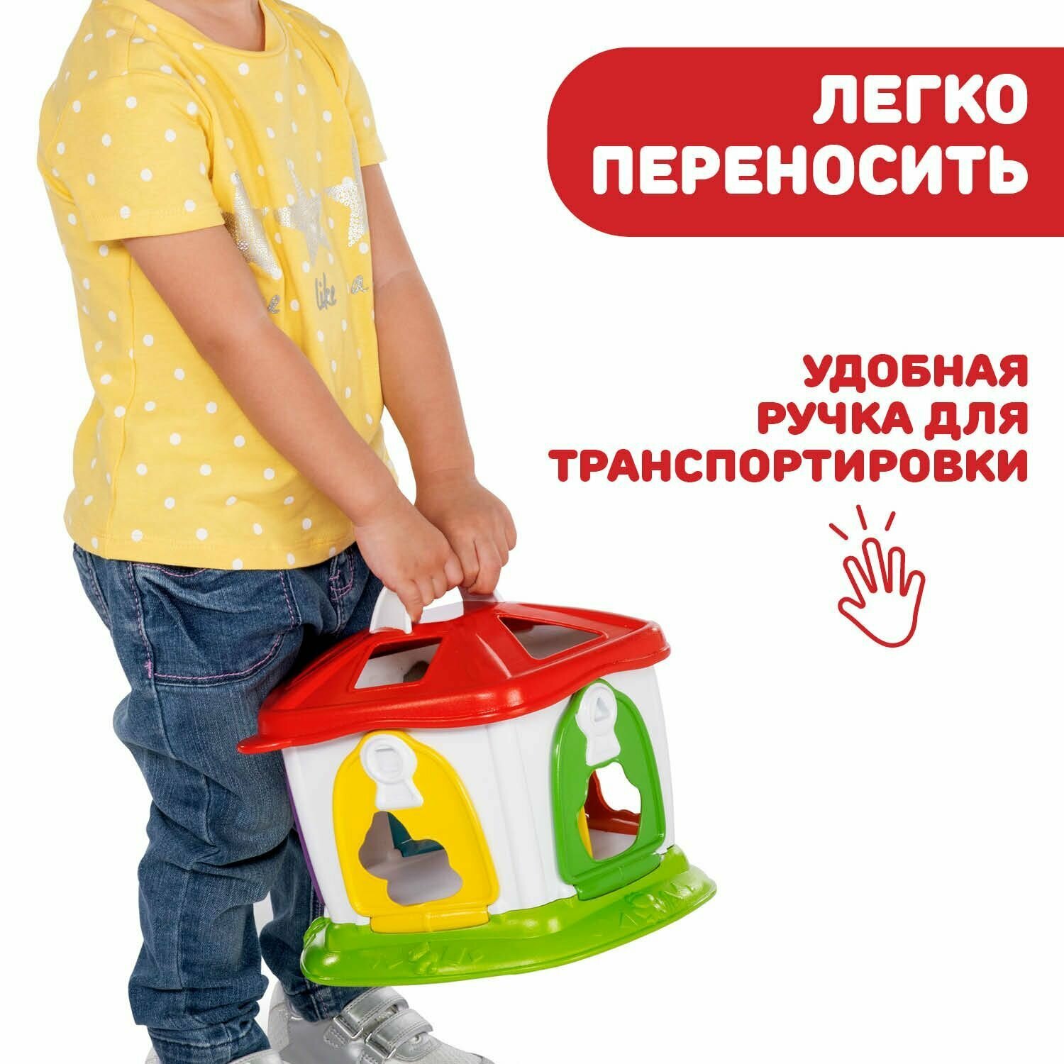 Игрушка-сортер Домик с животными - развивающая платформа, благодаря которой малыш будет учиться в процессе веселой игры. Игрушка представляет собой домик в форме пятиугольника, с каждой стороны которой находится дверь с углублениями под детали разных форм.