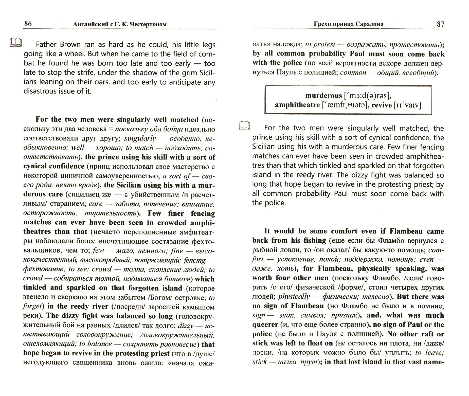 Продолжение приключений священника-детектива отца Брауна и его верного друга Фламбо в новеллах Г. К. Честертона "Грехи принца Сарадина" и "Глаз Аполлона". Рассказы адаптированы по методу обучающего чтения Ильи Франка: снабжены дословным переводом на русский язык и необходимым лекси-ко-грамматическим комментарием (без упрощения текста оригинала).
