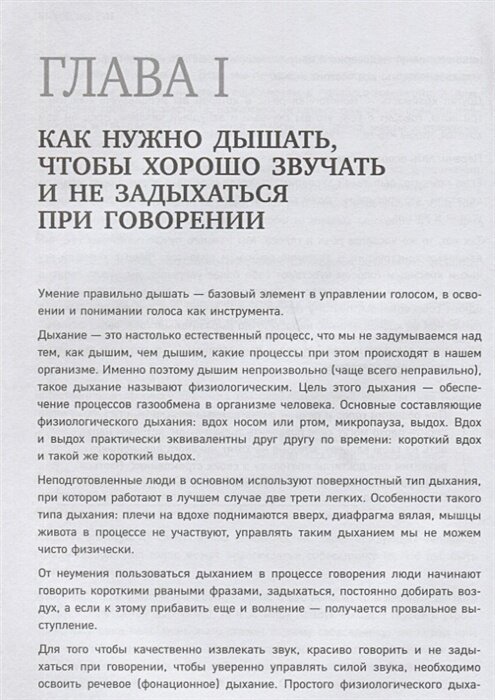 Я был приятно удивлен когда просмотрев доступный для чтения ознакомительный фрагмент, обнаружил широкий спектр направлений, развитие которых и определяет успешную коммуникацию, пошаговый подход для их освоения с последующим объединением составляющих. Даже в этом фрагменте приведено много упражнений, дыхательных техник, а что особенно важно уделено внимание безопасности выполнения этих упражнений, рекомендации прекратить их выполнение при изменении самочувствия. Книга в моей корзине, Рекомендую всем, без ограничений по возрасту и сферам деятельности. Спасибо автору.