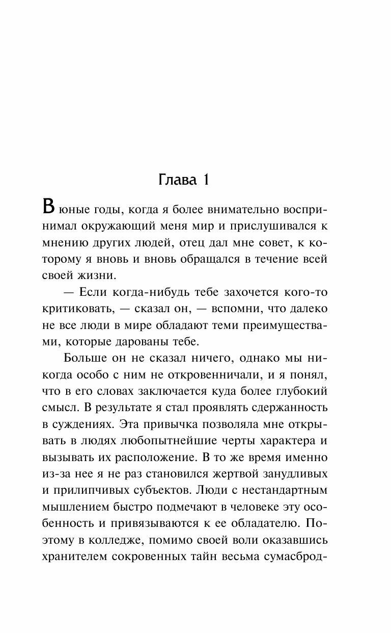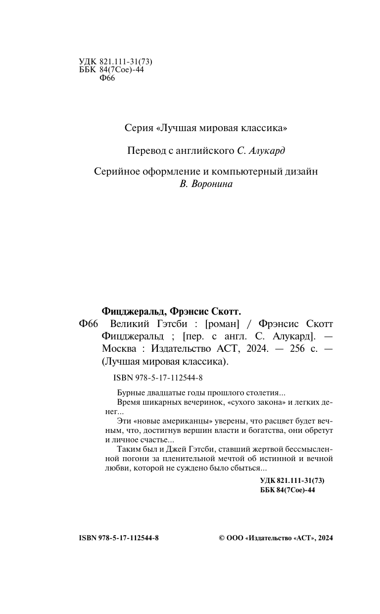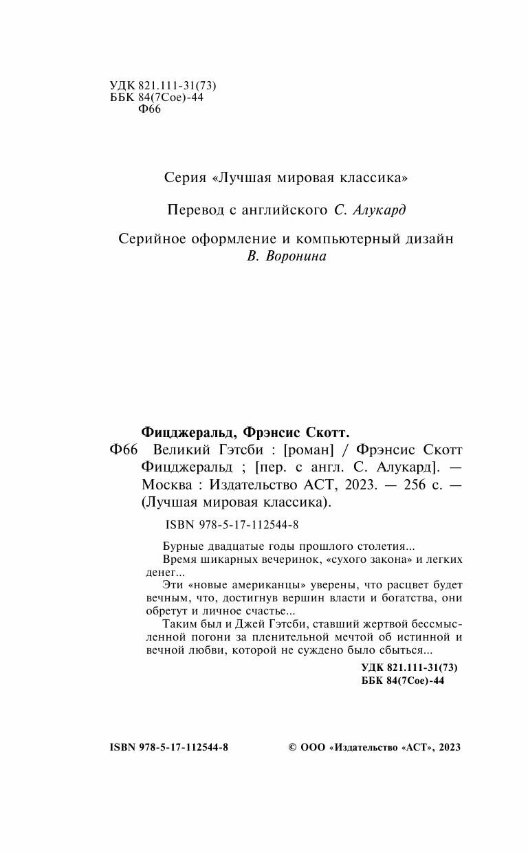 Бурные двадцатые годы прошлого столетия… Время шикарных вечеринок, "сухого закона" и легких денег… Эти "новые американцы" уверены, что расцвет будет вечным, что достигнув вершин власти и богатства, они обретут и личное счастье… Таким был и Джей Гэтсби, ставший жертвой бессмысленной погони за пленительной мечтой об истинной и вечной любви, которой не суждено было сбыться…Количество страниц: 256 Об авторе Фрэнсис Скотт Кей Фицджеральд США, 24 сентября 1896Американский писатель, крупнейший представитель так называемого «потерянного поколения» в литературе. Наибольшую известность Фицджеральду принес роман «Великий Гэтсби», опубликованный в 1925 году, а также ряд романов и рассказов об американской «эпохе джаза» 1920-х годов. Термин «эпоха джаза» или «век джаза» был придуман самим Фицджеральдом и обозначал период американской истории с момента окончания Первой мировой войны до великой депрессии 1930-х годов.