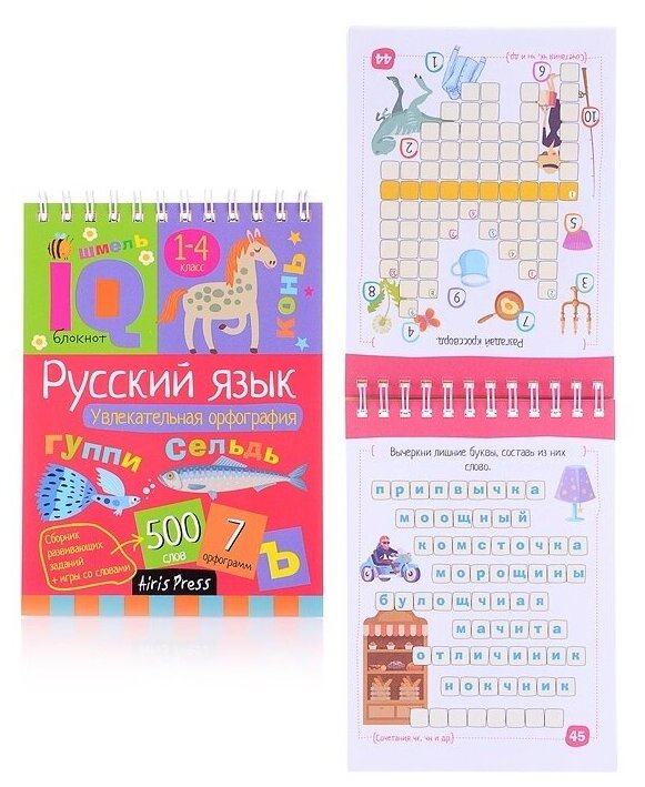 Блокнот "Увлекательная орфография" продолжает серию IQ-блокнотов по русскому языку. В нем содержится более 300 слов и 7 орфограмм на несколько важных правил русского языка, которые ребёнок должен усвоить в начальной школе: правописание двойных согласных в корне слова, мягкого и твёрдого знака, приставок, суффиксов и сложных слов с соединительными гласными. Кроссворды, ребусы, анаграммы, лабиринты и другие увлекательные игры-задания помогут ребёнку легко запомнить правила русского языка и научиться грамотно писать даже самые трудные слова, в которых нередко допускаются ошибки. Для повторения слов и отработки их правописания в блокноте заложена оригинальная система самопроверки - задания "Проверь себя" и ответы в конце блокнота. Простота и лёгкость использования блокнота позволяют выполнять задания не только дома и в школе, но и в транспорте и на природе, что делает обучение непринуждённым и в то же время эффективным.