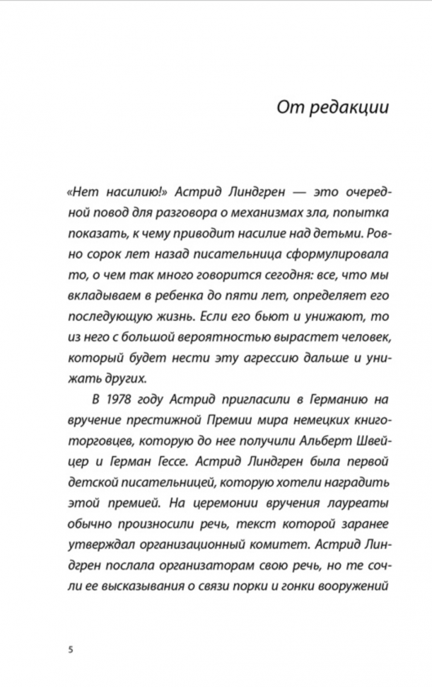 В 1978 году Астрид Линдгрен выступила со знаменитой речью в защиту прав детей на вручении престижной Премии мира немецких книготорговцев. Выступление писательницы наделало много шума. Благодаря нему начались споры о телесных наказаниях и правах ребенка. Спустя 40 лет вопрос о воспитании детей еще не решен однозначно, и мы надеемся, что выход книги напомнит о недопустимости любого насилия.