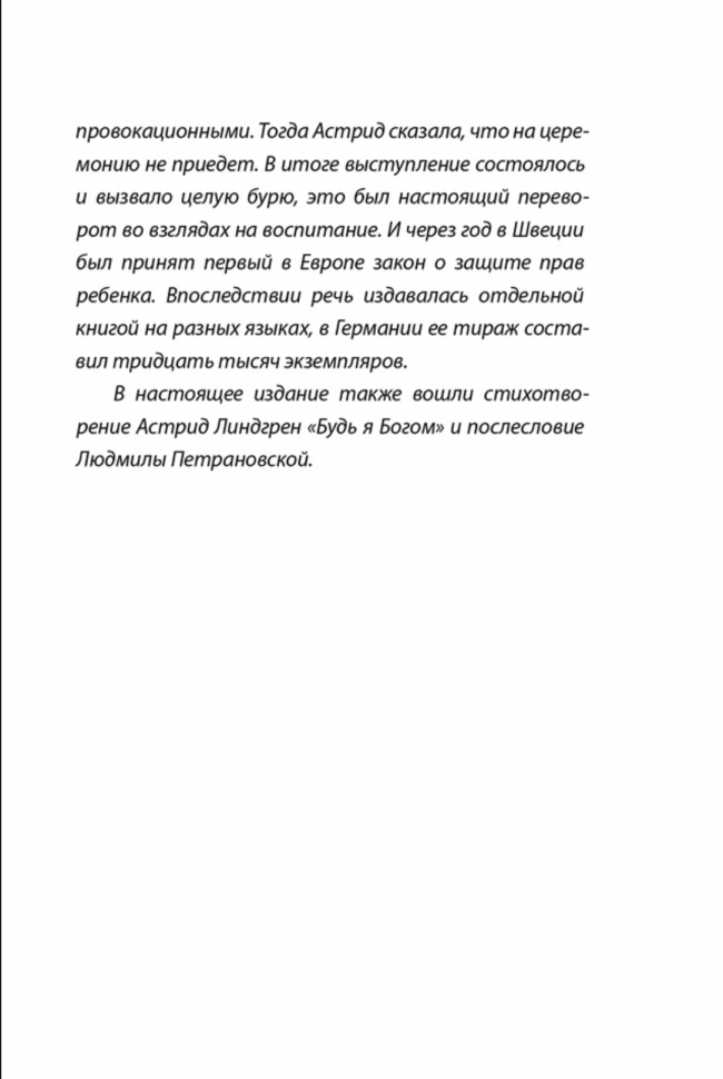 Книга тоненькая, но зато насколько в ней ценно каждое слово. Это речь Астрит после вручения премии мира, которая перевернула весь мир. Речь о насилии, о детях, о мире и войне о нашей с вами жизни и том что с ней делать особенно с маленькой жизнью наших детей. Послесловие от Петрановской, которая дополняет и поясняет немного речь Астрит. Для коллекции такую книгу иметь стоит, на форзаце росчерк (чувство что сама Астрит подписала свою речь), страницы плотные, есть несколько фото. Хорошего чтения господа.