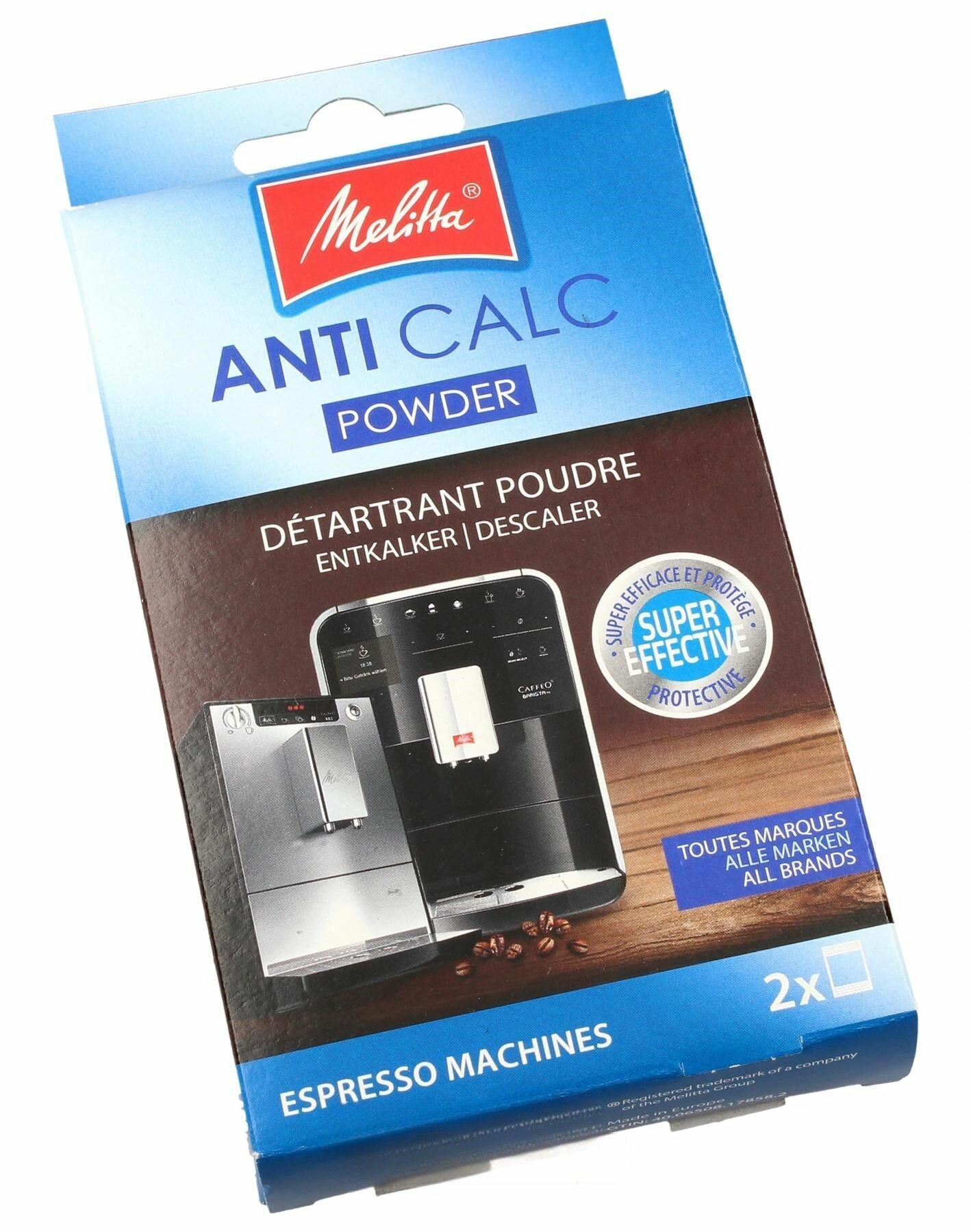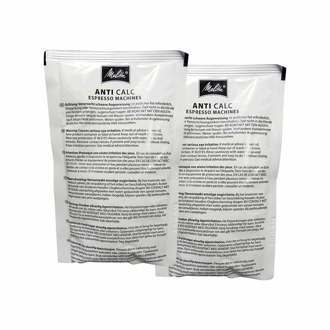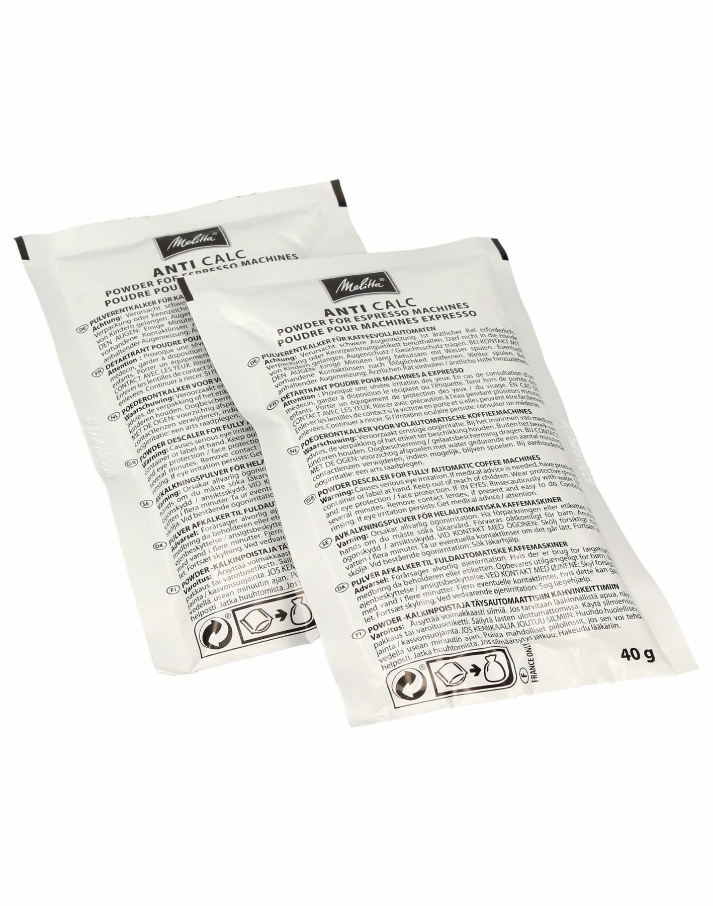 Порошок для удаления накипи (2 шт.) защитят вашу кофемашины от образования накипи.Необходимо регулярно удалять накипь в вашей кофемашине и чайнике.Подходит для всех кофемашин, кофеварок и чайников для проведении процедуры очистки от накипи.Гарантированная долговечность вашего прибора.Кофемашина/эспрессо-машина Melitta должна очищаться от накипи каждые 4–6 недель. Известковый налет образуется при нагревании воды. Это может привести к серьезным проблемам с кофемашиной, так как мелкие частицы накипи заблокируют трубки, переходники или тэн кофемашины.Инструкция: 1) Добавьте 500 мл чистой воды в резервуар для воды кофемашины Melitta. 2) Добавьте в него 1 порцию порошка для удаления накипи Melitta.3) Запустите программу удаления накипи машины.