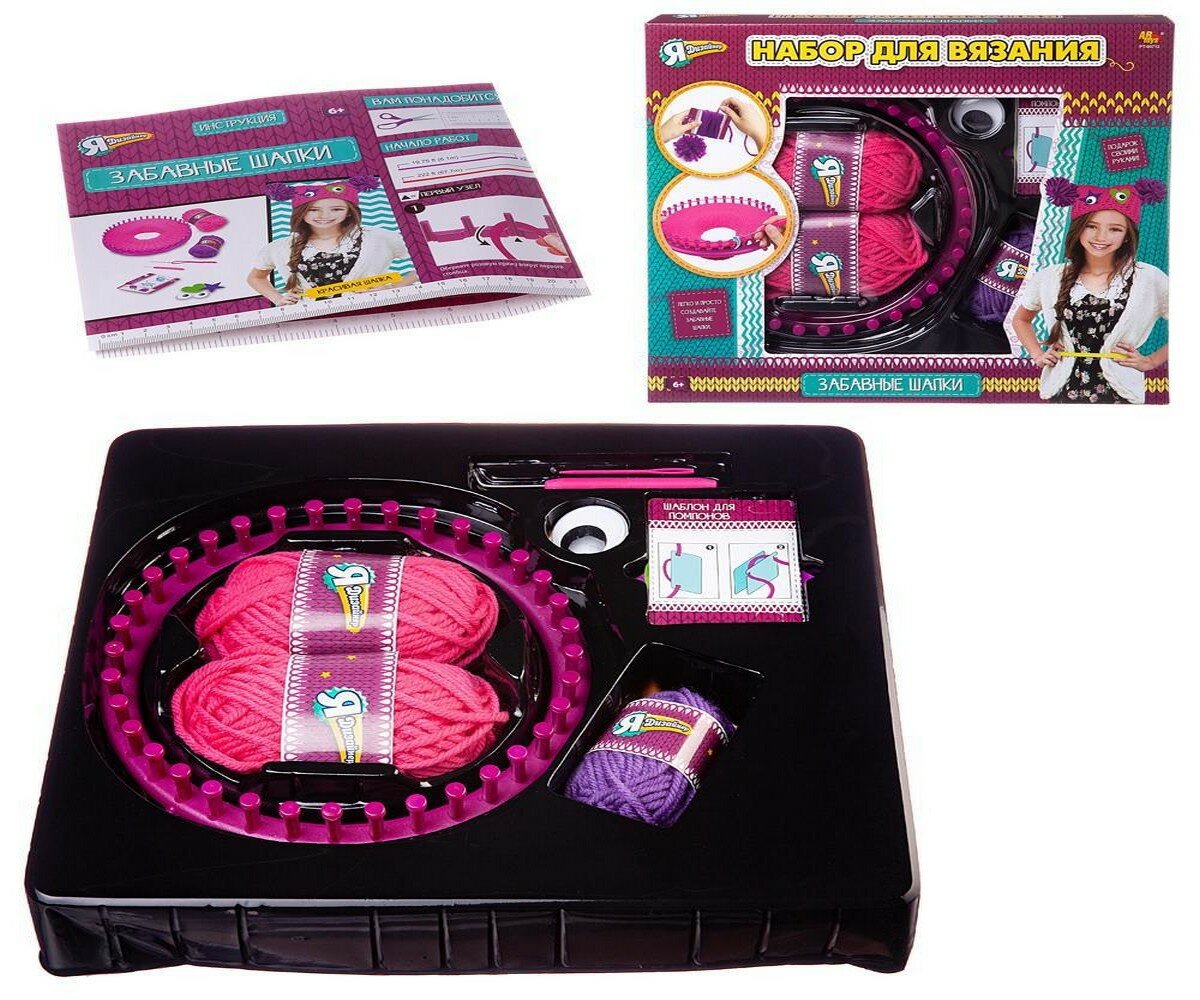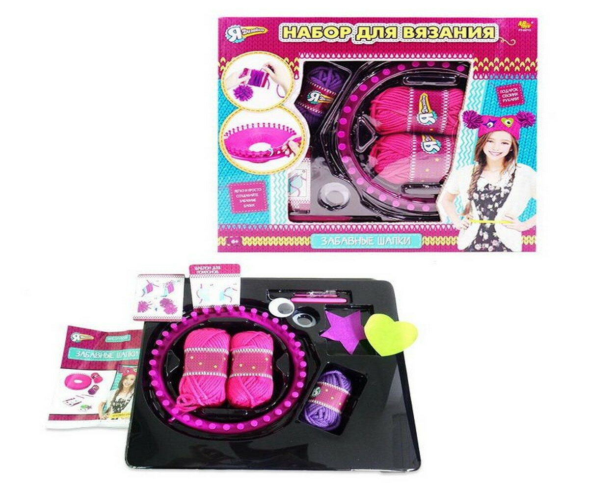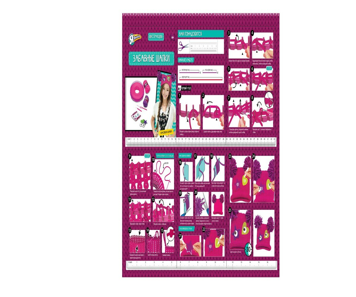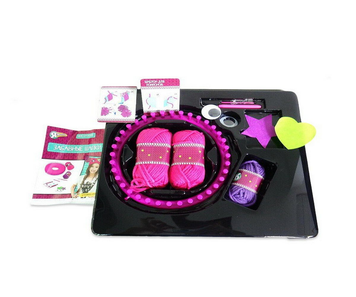 Набор для вязания забавных шапок. Комплектация: станок, иголка, крючок, пряжа 3 шт., сердце, звезда, глаза 2 шт., шаблон для помпонов 2 шт., инструкция.