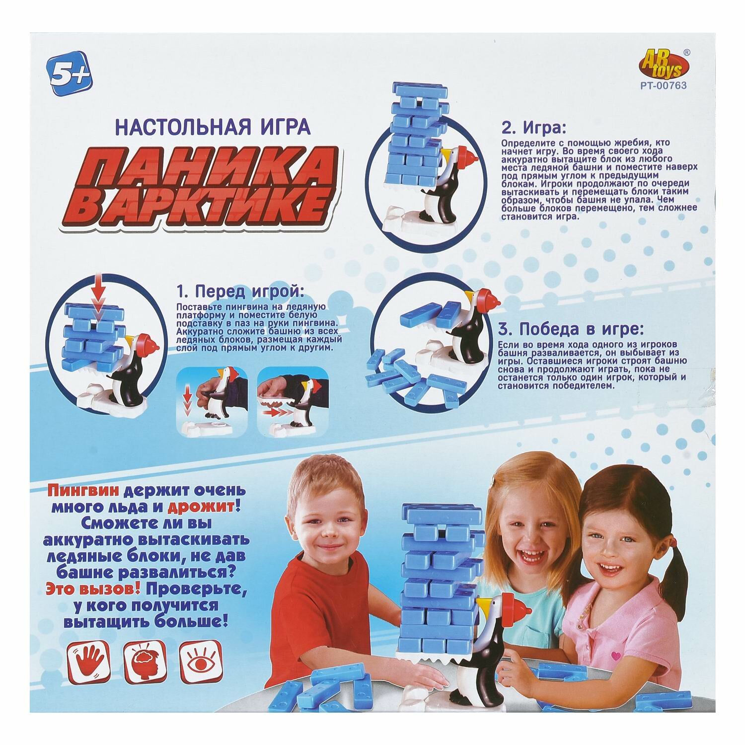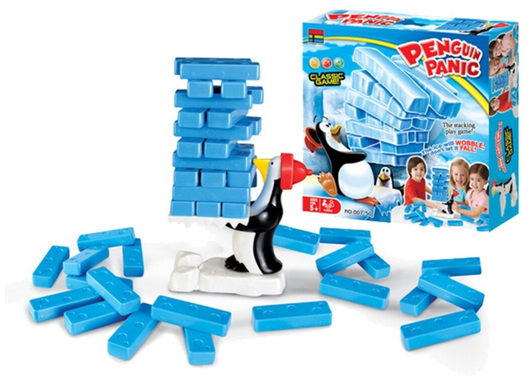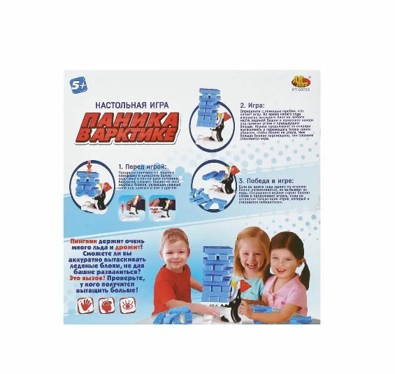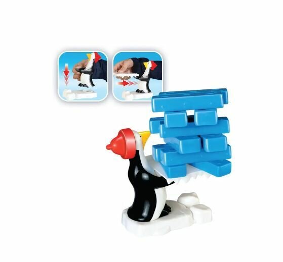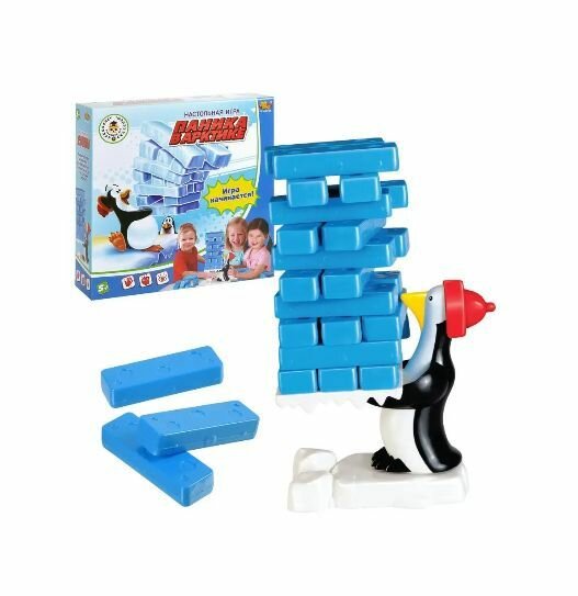 Комплектация: пингвин, ледяная платформа, белая подставка, 24 ледяных блока. Цель игры: вытащить ледяные блоки из башни, не дав ей развалиться. Правила игры указаны на коробке.
