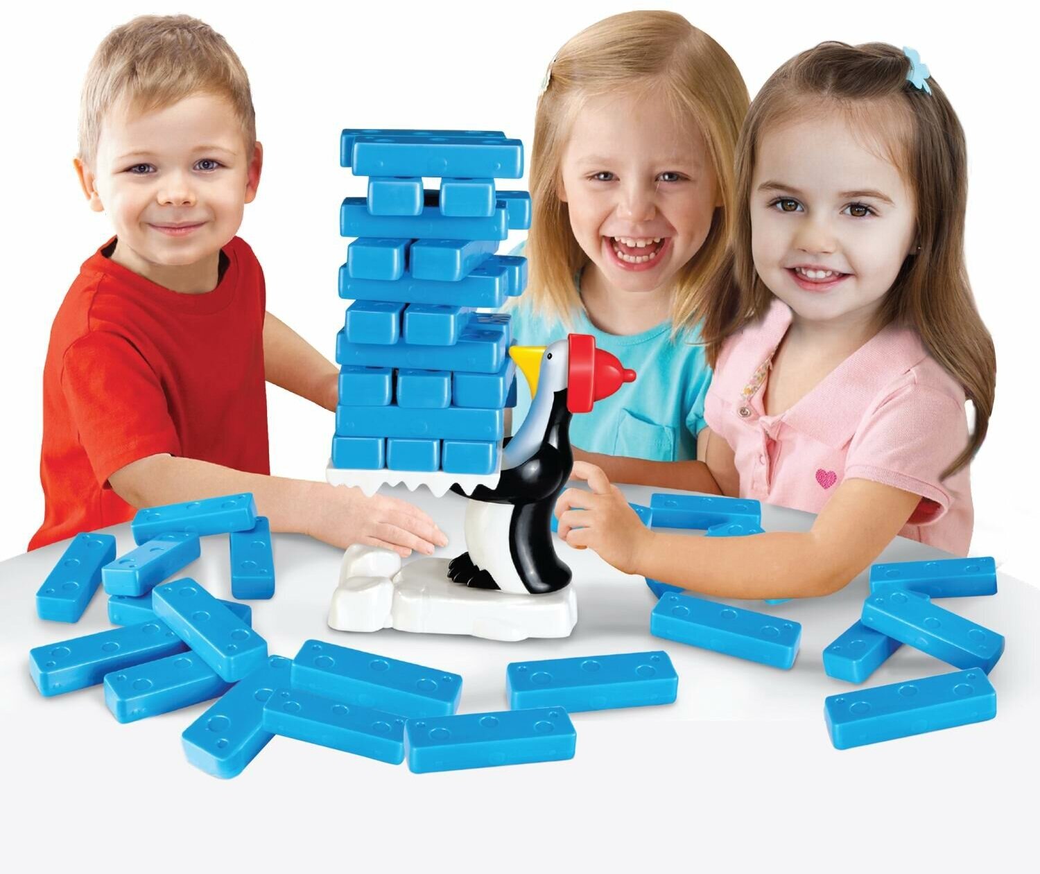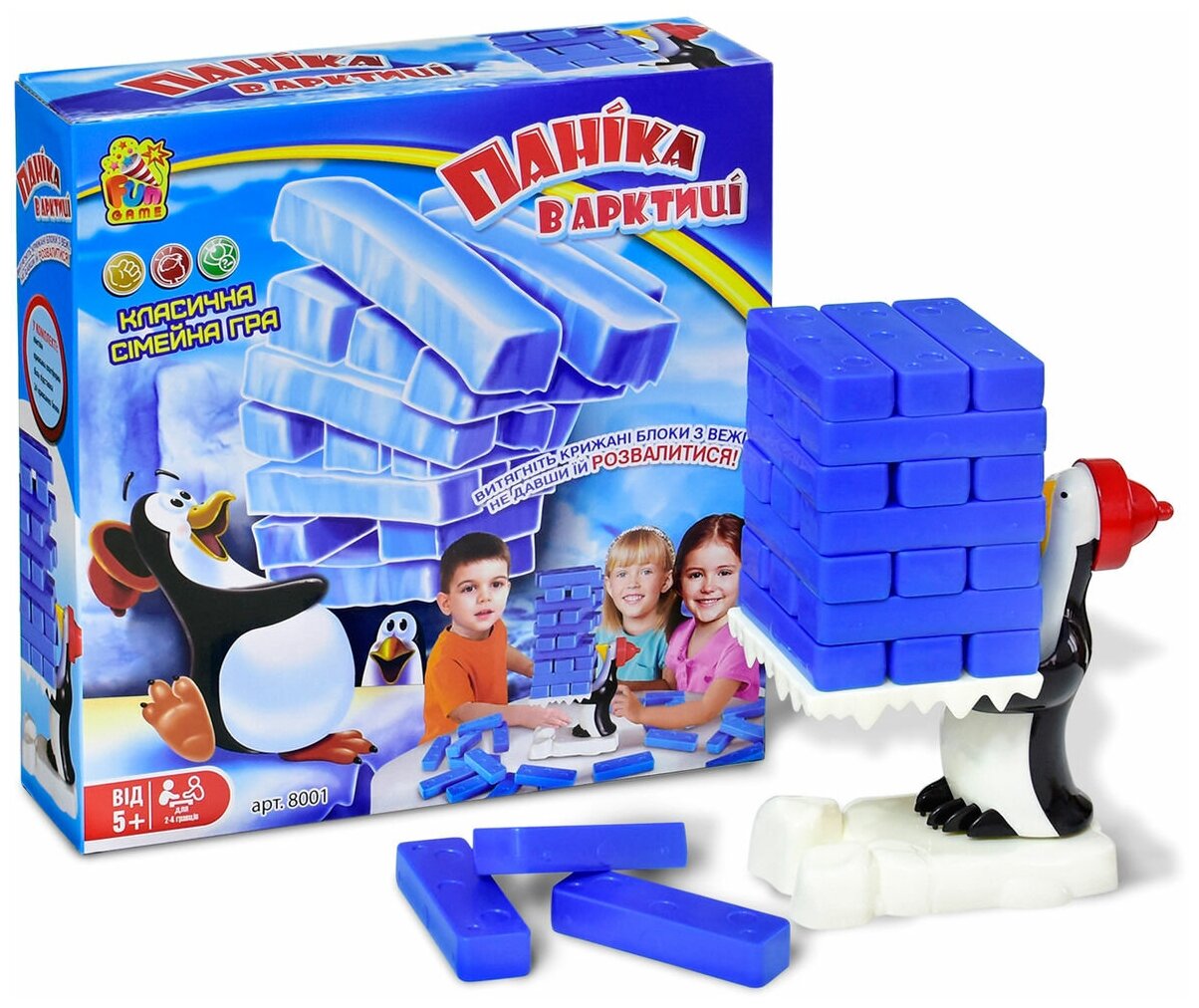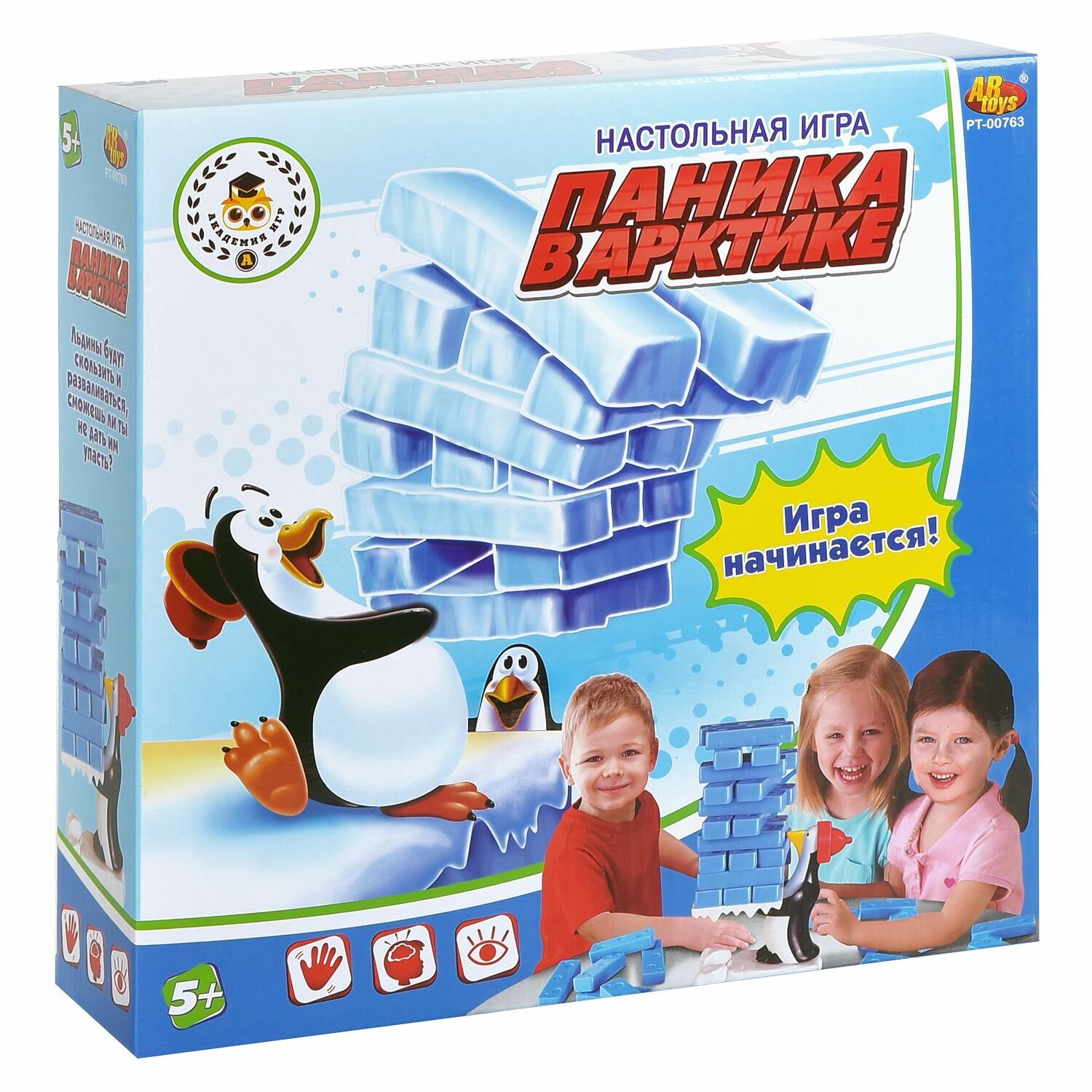 Комплектация: пингвин, ледяная платформа, белая подставка, 24 ледяных блока. Цель игры: вытащить ледяные блоки из башни, не дав ей развалиться. Правила игры указаны на коробке.