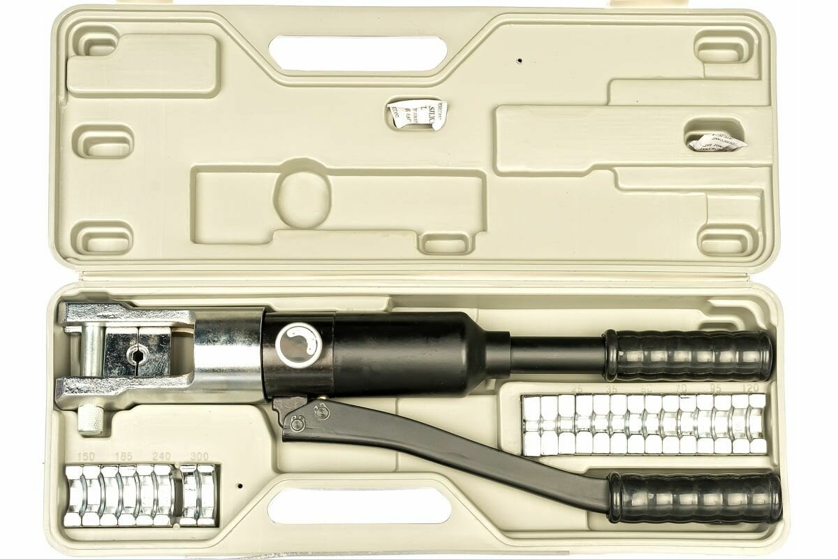 | Комлектация | Ручной гидравлический пресс, набор из 12 сменных матриц, ремкомплект (уплотнительные кольца), пластиковый кейс |