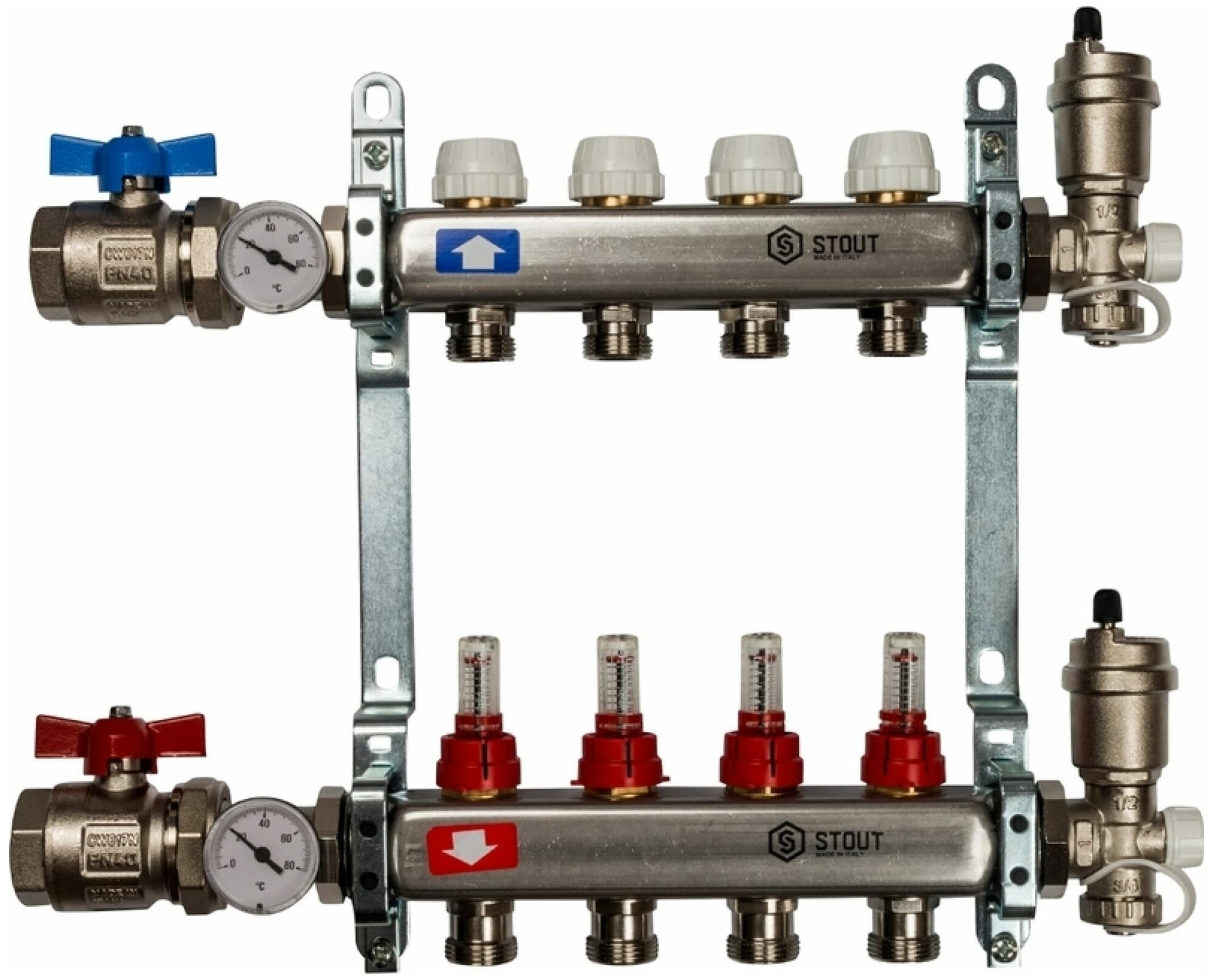 Коллектор с расходомерами STOUT (Стоут) предназначен для оснащения систем водняого отопления многоквартирных и частных жилых домов. Прибор обеспечивает равномерное распределение теплоносителя по контурам и позвляет легко регулировать температуру в отапливаемых помещениях. Модель выполнена из высокопрочной нержавеющей стали AISI 304 L и комплектуется автоматическими воздухоотводчиками и спускными кранами.