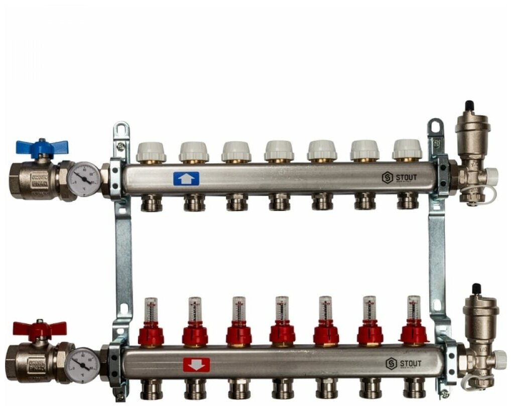 Коллектор с расходомерами STOUT (Стоут) обеспечивает равномерное распределение теплоносителя по контурам и повышает производительность систем водяного отопления и теплого пола в жилых зданиях. Корпус модели выполнен из высокопрочной нержавеющей стали AISI 304 L и надежно защищен от коррозии. Терморегулирующие клапаны можно автоматизировать с помощью термоэлектрического сервопривода.