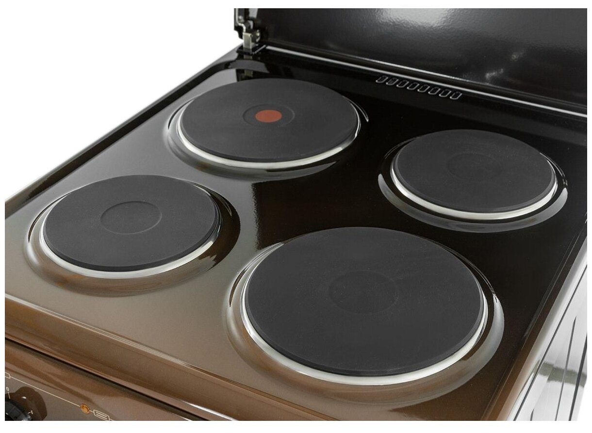 Плита Gefest оснащена 4 электрическими конфорками и электрической духовкой. Защитная крышка варочной поверхности предотвращает попадание брызг на стену. Режим гриля идеально подходит для быстрого приготовления сочного блюда с поджаристой корочкой. Полезный объем духовки составляет 52 литра. Внутреннее покрытие из эмали облегчает чистку стенок духовки.