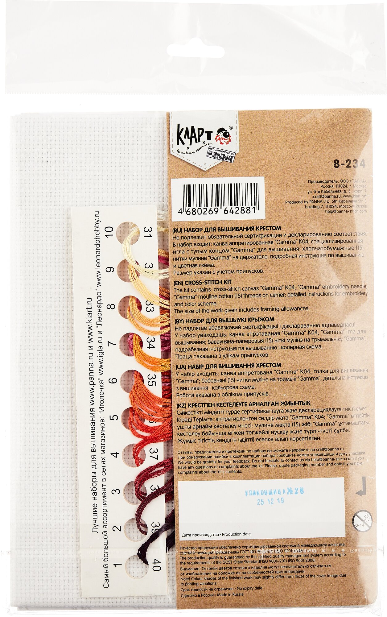 | В набор входит | канва К04 Aida №14 "Gamma" белого цвета, хлопковое мулине "Gamma" на держателе (15 цветов), цветная символьная схема, игла "Gamma", инструкция |