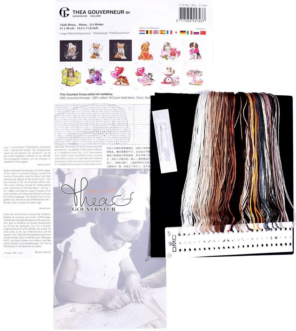 Наборы Thea Gouverneur укомплектованы качественными материалами, такими как мулине DMC из 100% хлопка и разные виды тканей для вышивания производства Zweigart. Наборы обозначенные буквой А после номера содержат в составе канву Aida, если в артикуле есть обозначение .05 – то этот набор укомплектован канвой Aida чёрного цвета. Также в ассортименте есть наборы на 100% льне и канве Jobelan. Черно-белые схемы тщательно прорабатываются вручную. Используется богатая цветовая палитра ниток, но в ассортименте компании есть и монохромные дизайны. Нитки разобраны по символам и закреплены на органайзере. Стрелка на бумажном органайзере указывает вверх, определяя правильность чтения символов.