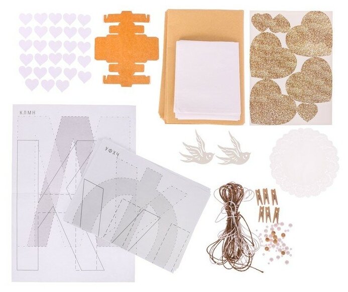 В набор входит: чипборды, шаблоны, дек. лента, деревянные шпажки, картонные заготовки, дек. шнур, инструкция. Размер: ассорти. Производитель: Арт Узор. Тип товара: Набор украшений. Повод: Свадьба.