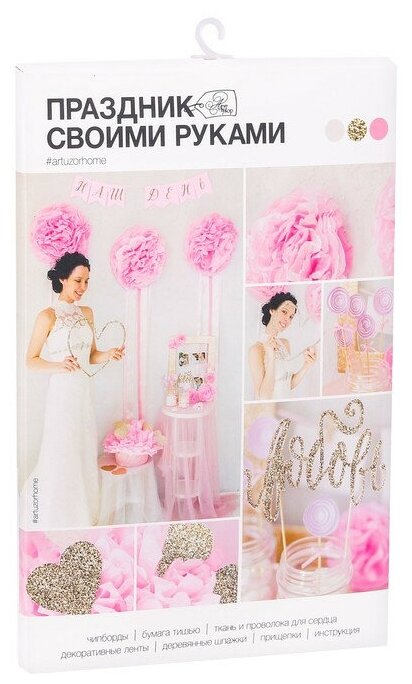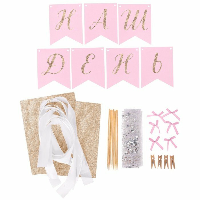 В набор входит: ткань, чипборды, бумага тишью, проволока для сердца, декоративные ленты, деревянные шпажки, прищепки, инструкция. Размер: ассорти. Производитель: Арт Узор. Тип товара: Набор украшений. Повод: Свадьба.