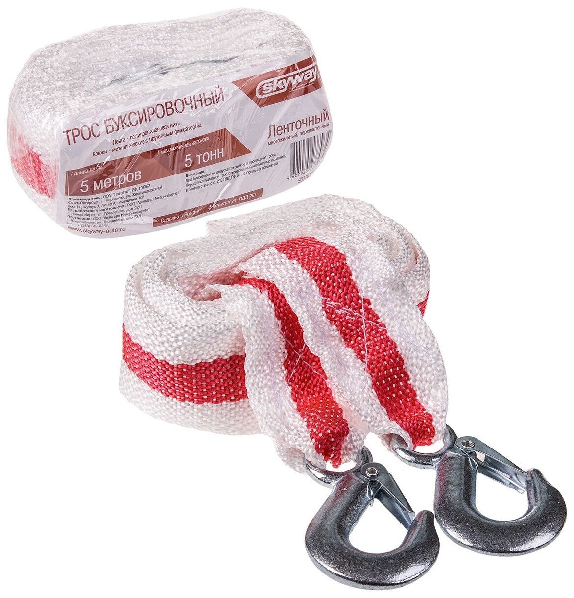 Трос ленточный 5т 5м 2 крюка SKYWAY в пакете - - многожильный переплетённый трос из высококачественных материалов. Изготовлен из специальной полиэфирной нити, которая увеличивает прочность и срок службы. Упакован в пакет. На концах прочные металлические крюки для крепления, которые способны выдерживать большие нагрузки.