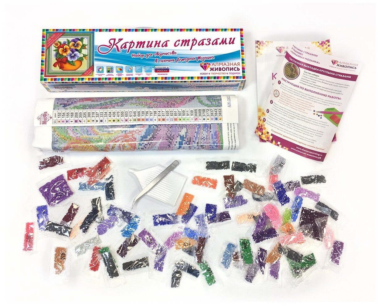 | В набор входит | полотно-схема с клеевым слоем, с условными обозначениями, инструкция, пластиковое блюдце, стилус, упакованные стразы |