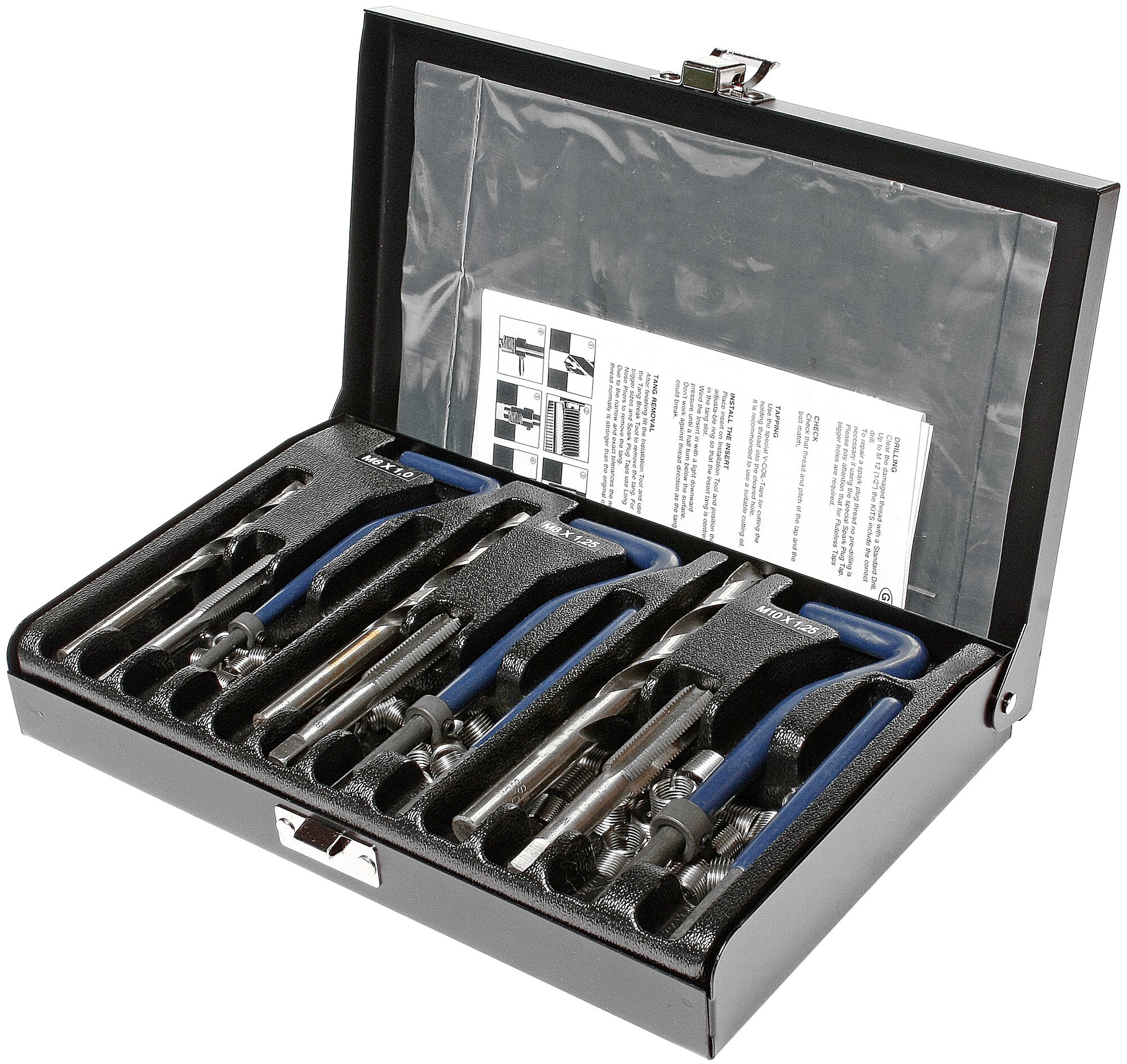 Набор инструментов JTC- предназначен для восстановления повреждённой резьбы в отверстиях диаметром М6, М8 и М10. В комплекте идут свёрла, метчики, установочный инструмент и инструмент для обламывания хвостовика. Всё это упаковано в удобный кейс для хранения и транспортировкиПреимущества Материалы инструментов: свёрла и метчики изготовлены из быстрорежущей стали HSS, монтажный инструмент и инструмент для обламывания хвостовика — из стали Ремонтная резьбовая вставка — из нержавеющей стали SUS304 Удобная упаковка: набор поставляется в пластиковом кейсе для хранения и транспортировки