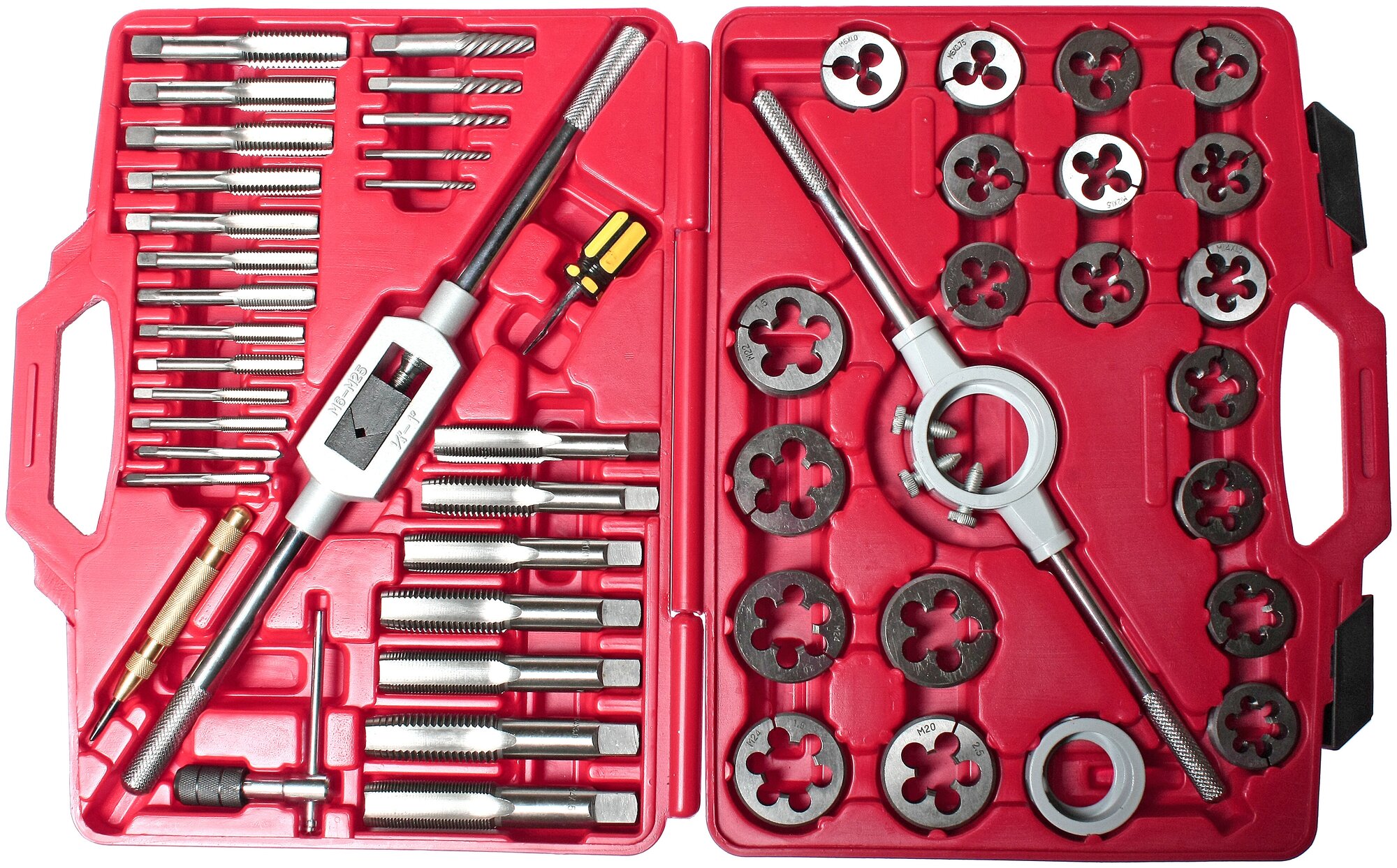 Набор метчиков и плашек JTC Auto включает в себя 51 инструмент, который используется при нарезке внутренних и наружных резьб. В набор входят: метчики, плашки, плашкодержатель, метчикодержатель, экстракторы, ключ для метчиков с Т-образной рукояткой, кернер, адаптер, отвертка.