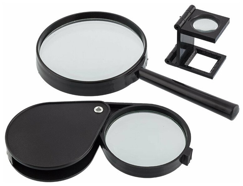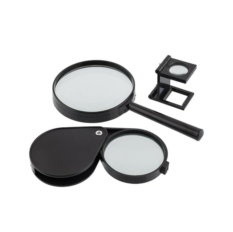 Комплект луп для рукоделия, творчества. Удобно использовать в изготовлении миниатюрных поделок, для чтения и многого другого. В комплект входят: - лупа с ручкой с 3-х кратным увеличением. Длина-18 см, диаметр 9 см. Материал: черный пластик PP, линза-стекло.- лупа складная с 4-х кратным увеличением. Диаметр 6 см. Материал: черный пластик ABC, линза-стекло. - лупа на подставке с 8-ми кратным увеличением, имеет деления. Материал ABS-пластик черного цвета, линза-акрил.