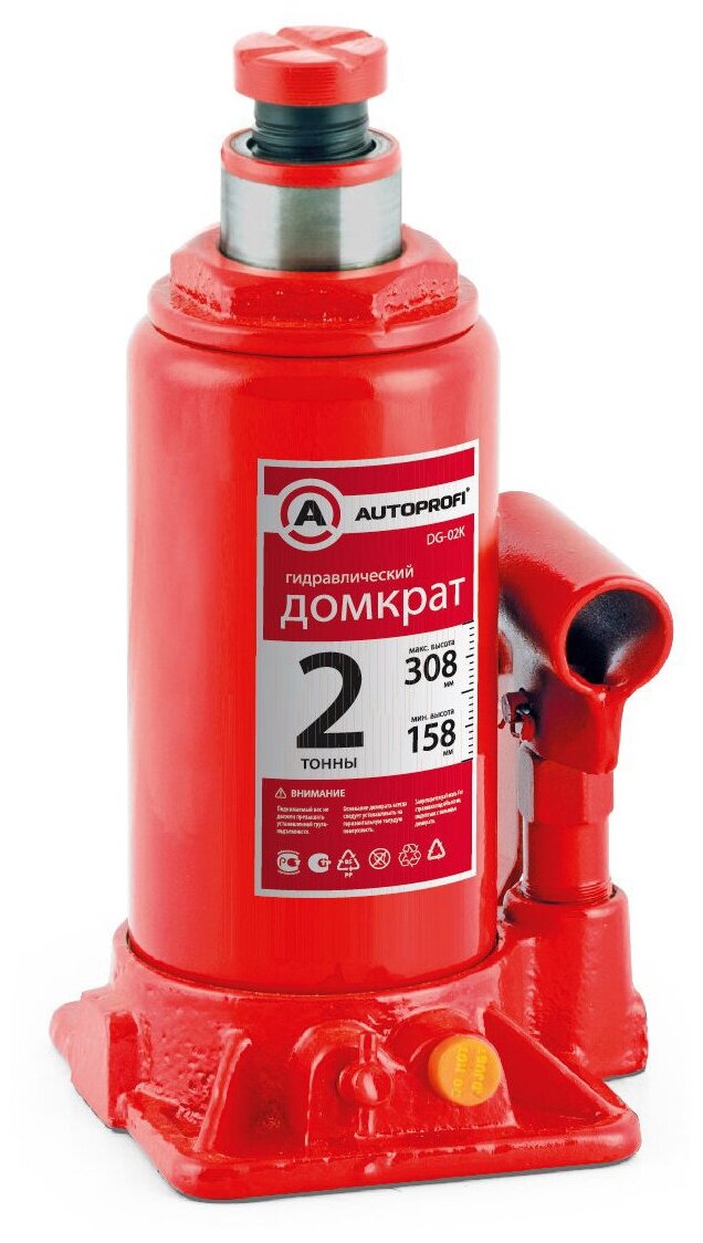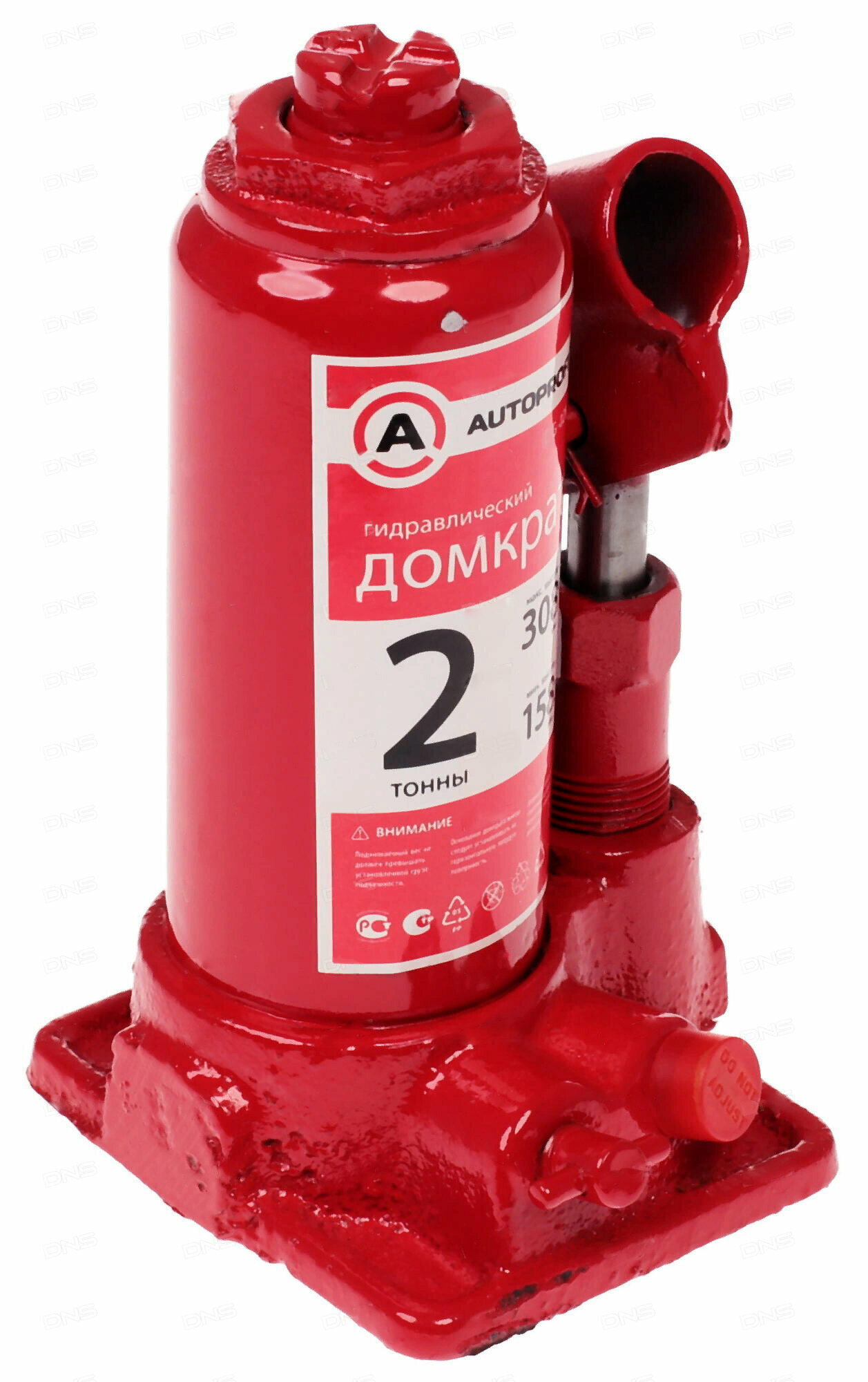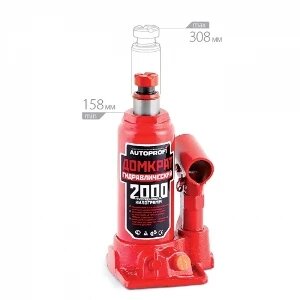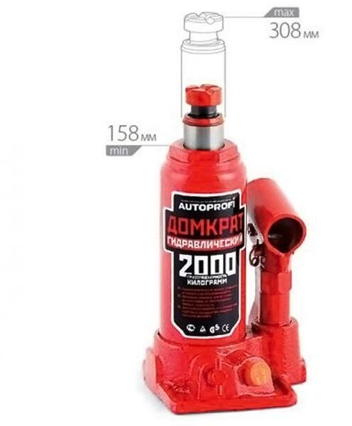 Домкрат бутылочный AUTOPROFI, гидравлический, 2 тонны, защита от перегруза, высота подъёма 158 - 308 мм, в кейсе.Автомобильный гидравлический домкрат с рабочей высотой до 308 мм. В сложенном состоянии занимает всего 158 мм по высоте. Максимальный груз — 2 тонны. Встроенная защита от перегруза.Перепускной клапан допускает перегрузку на 25%, но препятствует использованию домкрата при недопустимой нагрузке.Бутылочный домкрат предназначен для работы на твердой и ровной поверхности. После подъема груза его нужно зафиксировать настраховочных опорах (продаются отдельно).В комплекте поставляется удобный для хранения и переноски кейс с ручкой.