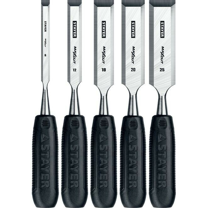 Набор стамесок с пластмассовыми ручками STAYER предназначен для выборки гнезд, пазов и отверстий, строгания, подрезки плоскостей и выступов, обработки криволинейных поверхностей, зачистки кромок и торцов, снятия фасок, неглубокого долбления.Преимущества Эффективная заточка на протяжении всего срока службы Изготовлены из прочной рессорно-пружинной стали Лезвие закалено до твердости 62 HRC на 2/3 своей длины Насечки для предотвращения выскальзывания из рук Плоская и широкая форма рукоятки для легкого позиционирования Рукоятка из ударопрочного ABS-пластика: возможность выполнения ударных работ киянкой Размеры стамесок: 6, 12, 16, 20, 25 мм