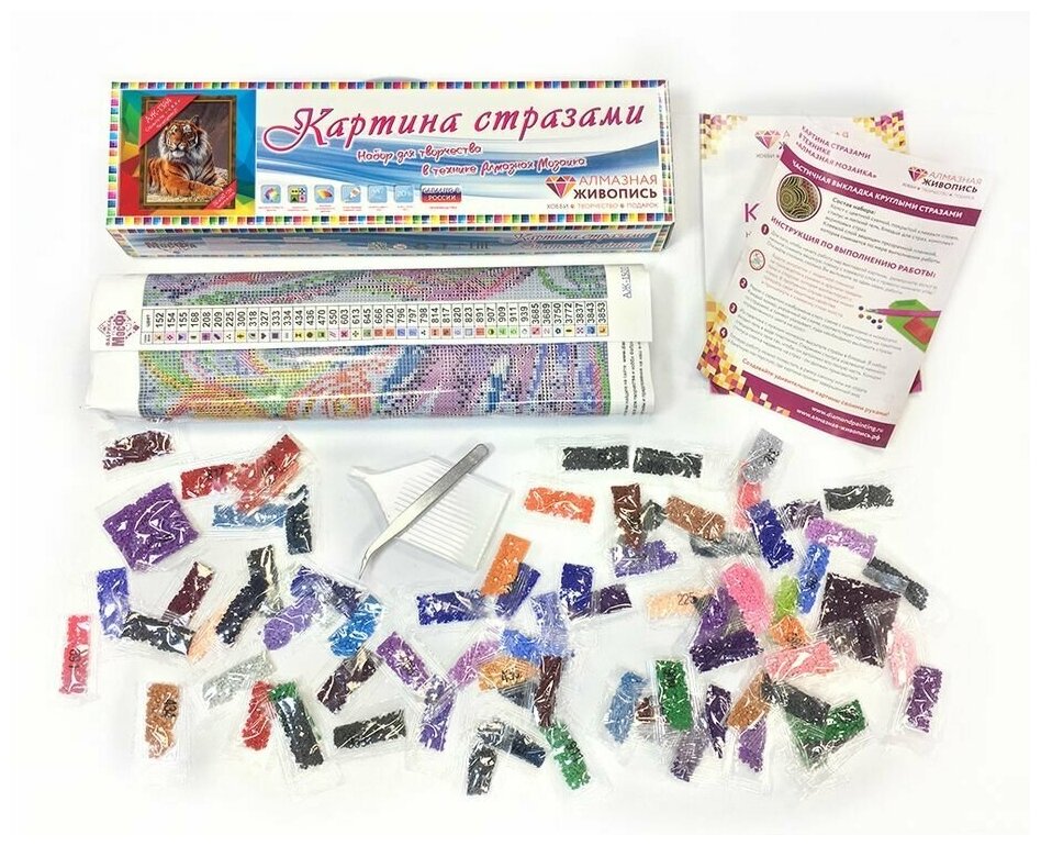 | В набор входит | полотно-схема с клеевым слоем, с условными обозначениями, инструкция, пластиковое блюдце, пинцет, упакованные стразы |
