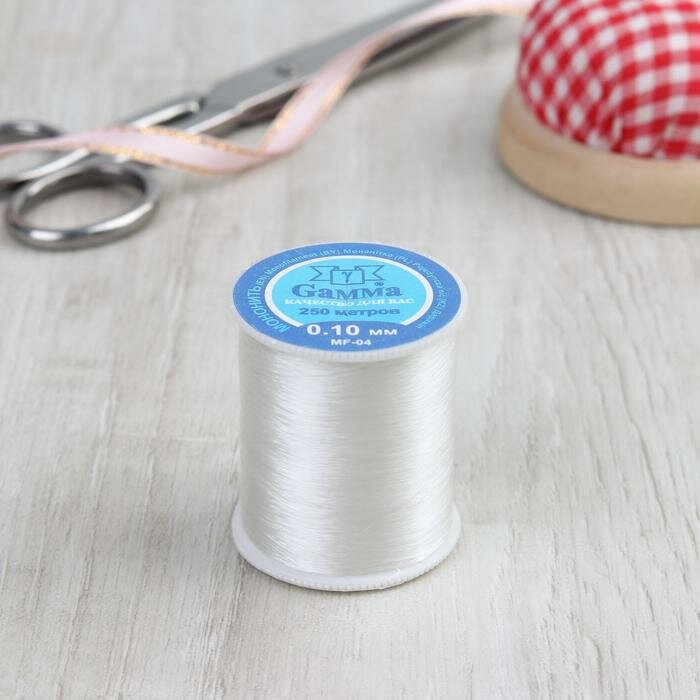 Мононить Gamma MF-04 0.10 мм 100 % нейлон 12 х 250 м белый Мононить - мягкая и тонкая прозрачная нить. Применяется для бисероплетения и вышивания бисером, стеклярусом и бусинами, а также для создания незаметных строчек и швов на подшивочных машинах. Нить абсолютно незаметная на лицевой стороне. Применение прозрачных ниток: черных — для темных тканей, белых — для светлых - это исключает перезаправки швейной машины при изменении цвета обрабатываемого материала, а также необходимость запасов ниток разных цветов на рабочем месте. Мононить используется в основном для легких тканей средней плотности. Артикул: MF-04 Толщина: 0.10 мм Состав: 100 % нейлон. Намотка: 250 м