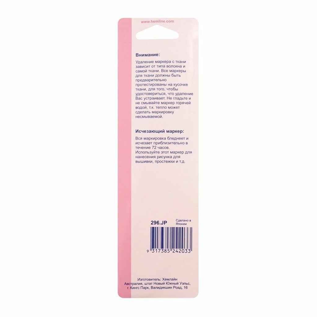 Маркер для ткани исчезающий, супертонкий Премиум HEMLINE 296. JP Новое качество "Премиум". Наносит четкие тонкие линии, толщиной 0,5 мм. Используется для квилтинга, вышивки или шитья. Вся маркировка бледнеет и исчезает приблизительно за 48 часов. Отлично подходит для использования на тканях, не пригодных для стирки. При необходимости линии можно удалить влажной тканью или смыть холодной водой. Перед применением рекомендуется протестировать маркер на ненужном кусочке ткани, так как состав волокон ткани может влиять на время исчезновения линий. Вся временная маркировка должна быть удалена до утюжки или стирки с использованием моющих средств ! Избегать хранение маркера при температуре ниже, чем 0 градусов. Не оставляйте маркер без колпачка на долгое время. Храните маркер в вертикальном положении тонким стержнем вверх.