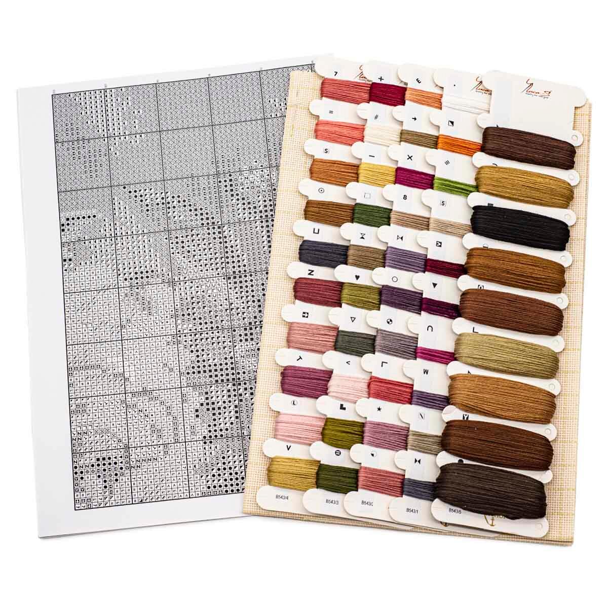 | В набор входит | канва Aida 18 Zweigart светло-бежевого цвета (разлинованная), хлопковое мулине Anchor 49 цветов, игла, символьная схема, инструкция |