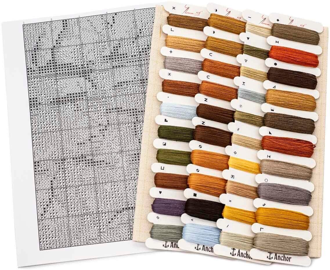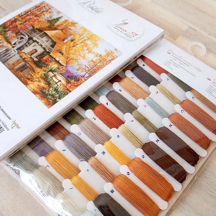 | В набор входит | канва Аида 18 Zweigart светло-бежевого цвета, хлопковое мулине Anchor 36 цветов, игла, чёрно-белая символьная схема, инструкция на русском языке |