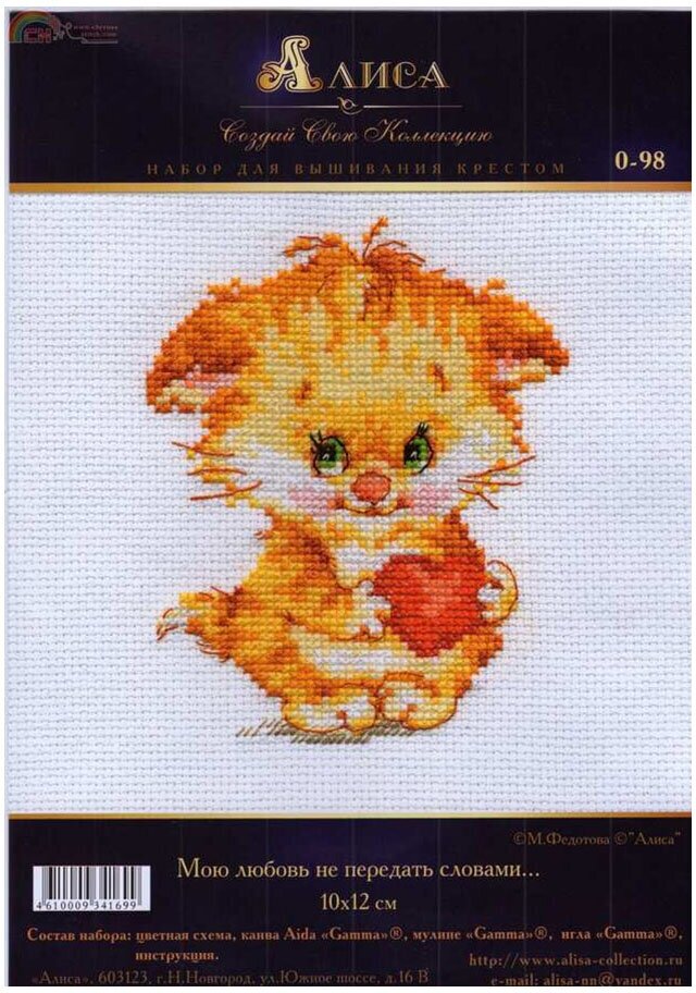 Вышивка крестом один из самых знаменитых видов рукоделия, имеющий многовековую историю. На протяжении многих столетий рукодельницы, владея такой техникой, создавали настоящие шедевры.Все наборы для вышивания крестиком Алиса комплектуются только самыми качественными материалами:Мулине фирмы Gamma™ изготавливается из 100% хлопка, имеет ровную окраску и двойную мерсеризацию.Канва, входящая в комплект наборов для вышивки Алиса пропитана специальным составом и не деформируется после стирки.Схемы для вышивки, входящие в комплект наборов, удобные и понятные, а все обозначения выполнены в цвете, что по достоинству оценит каждая любительница вышивки.В набор для вышивания входят:- Канва: Aida 14, Gamma, белого цвета, 100% хлопок.- Мулине: Gamma, 100% хлопок.- Количество цветов: 13.- Инструкция: подробная, на русском языке.- Игла: "Gamma".Техника вышивания: счетный крест.Артикул: 0-98.Размер готовой работы: 10x12 см.
