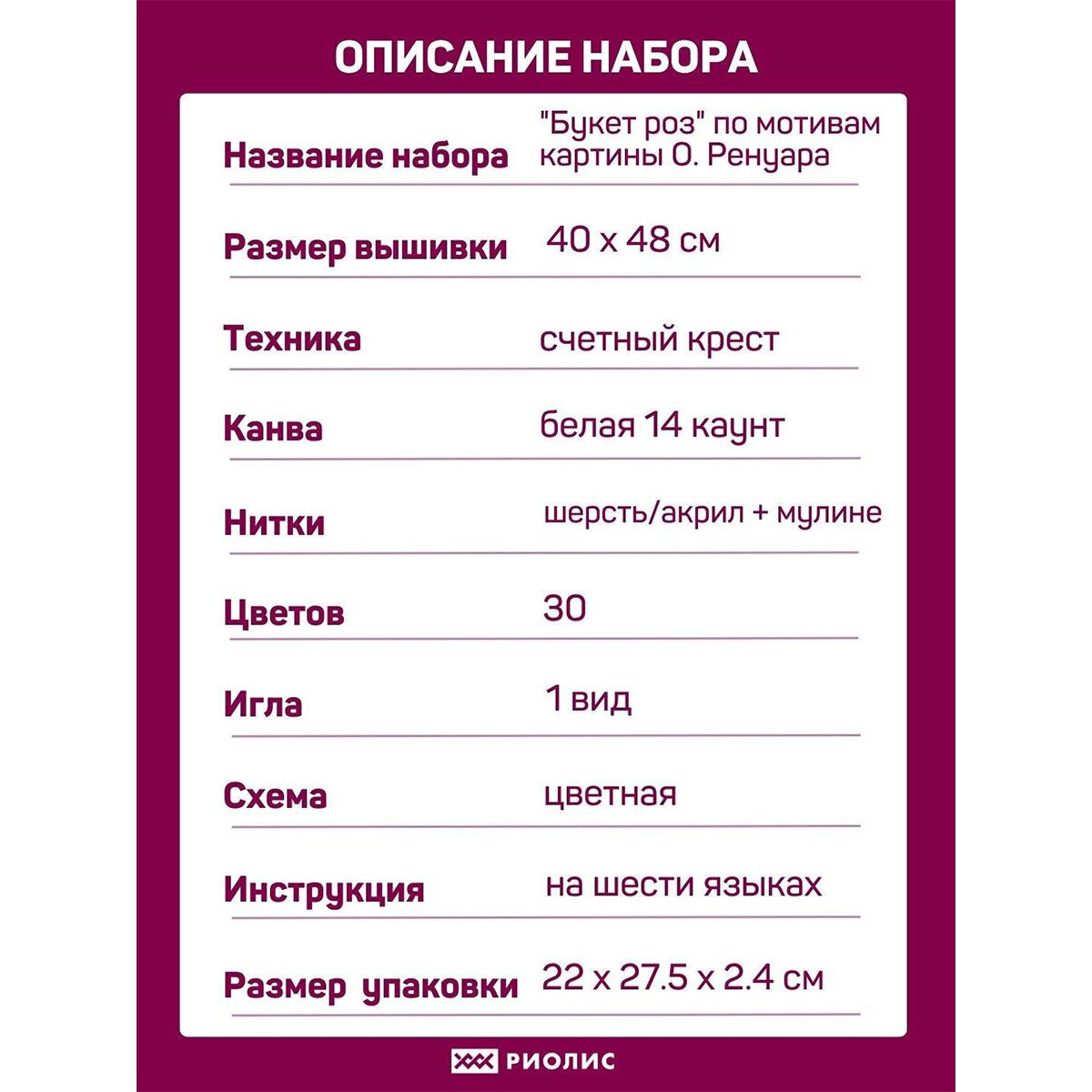 На сегодняшний день товар «1402 "Букет роз по мотивам картины Пьера Огюста Ренуара" Риолис (Сотвори Сама) (размер: 40х48 см)» можно купить с кешбеком в 1 магазине: Яндекс.Маркет