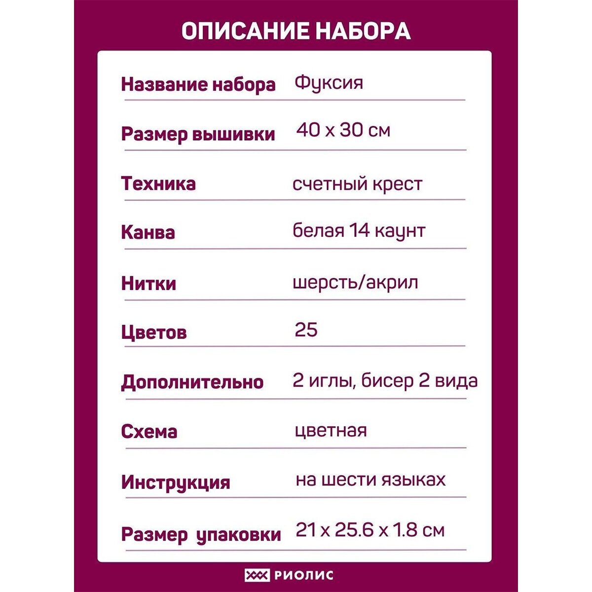 Чтобы вышивать крестиком, не потребуются особые навыки – достаточно проявить терпение, усидчивость и аккуратность. Вышивать по крупной сетчатой канве Aida 10 удобно и просто. В наборе для вышивки крестом 'Фуксия' используются шерстяные мулине – они позволяют плотно зашивать крупную сетчатую канву Aida 10, стежки получаются матовыми, достаточно объемными. Следуйте инструкции, выкладывайте равномерные стежки, и постепенно из-под вашей иглы начнет 'проступать' картина со сложной гаммой, плавными цветовыми переходами.