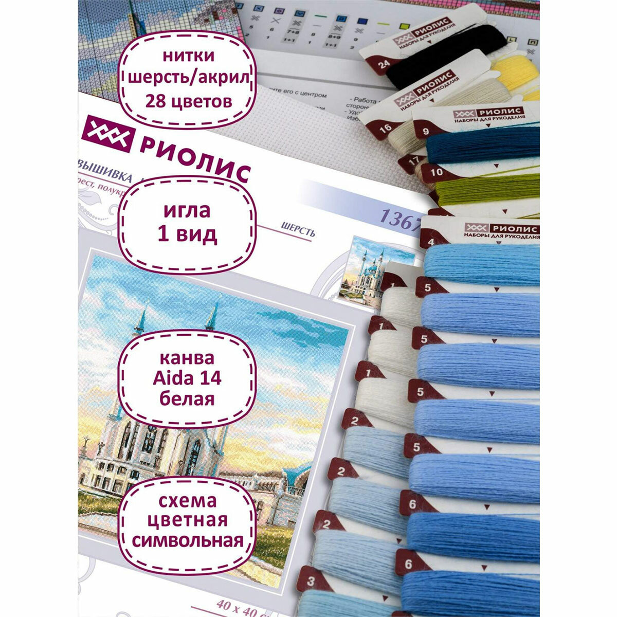 | В набор входит | Нитки шерсть, канва Аида 14 белая, цветная схема, игла, инструкция |