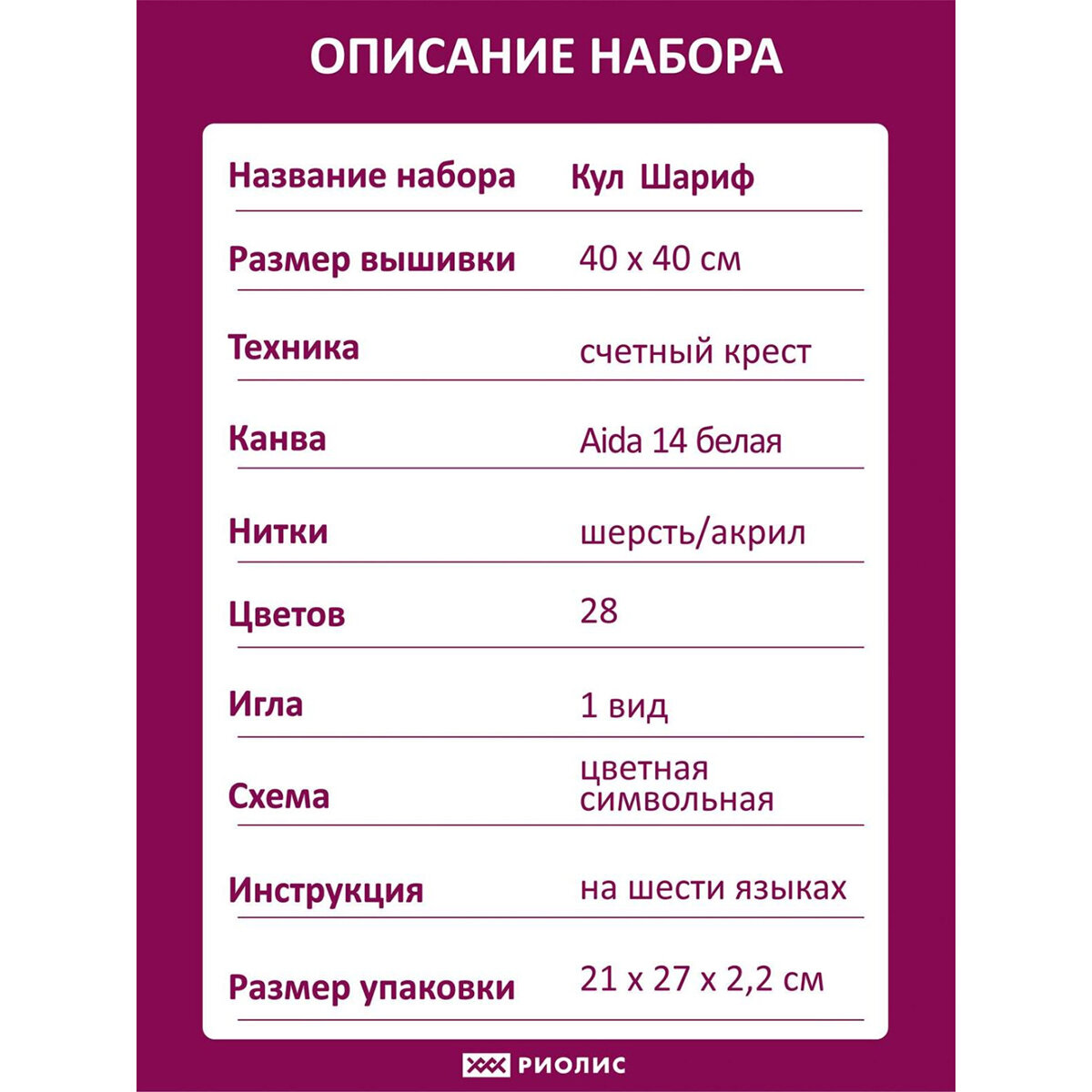 Чтобы вышивать крестиком, не потребуются особые навыки – достаточно проявить терпение, усидчивость и аккуратность. В наборе для вышивки крестом 'Кул Шариф' используются шерстяные мулине – они позволяют плотно зашивать сетчатую канву Aida 14, стежки получаются матовыми, достаточно объемными. Следуйте инструкции, выкладывайте равномерные стежки, и постепенно из-под вашей иглы начнет 'проступать' картина со сложной гаммой, плавными цветовыми переходами.Совет: если вам не хватает опыта, сделайте разметку канвы, ориентируясь по схеме. Разметка поможет вам быстрее закончить вышивку и избежать возможных ошибок. При необходимости осторожно постирайте вышивку вручную в прохладной воде с небольшим количеством мыла, чтобы не допустить усадки.В наборе: канва Aida 14 Zweigart белая, нитки для вышивания шерстяные, игла, цветная схема, инструкция.Количество цветов: 28.