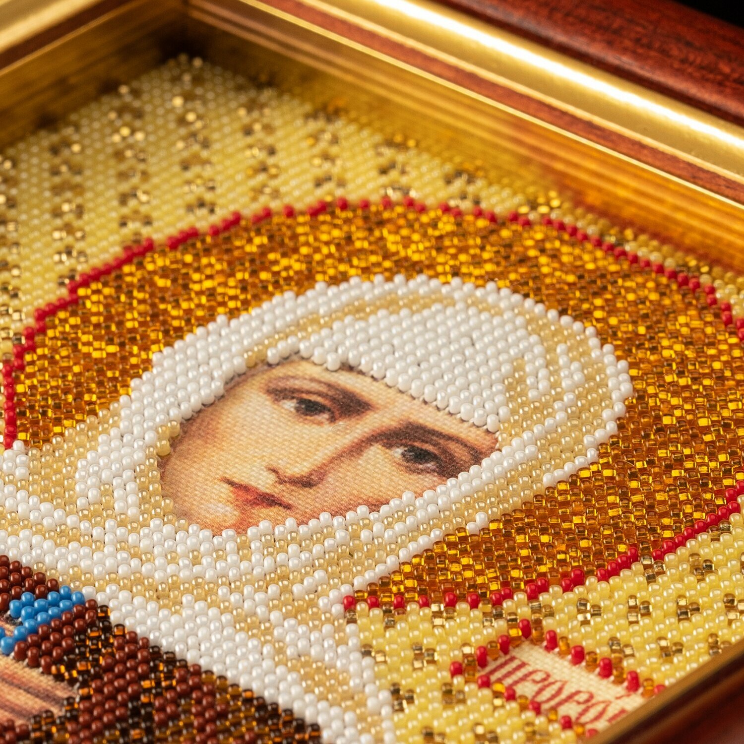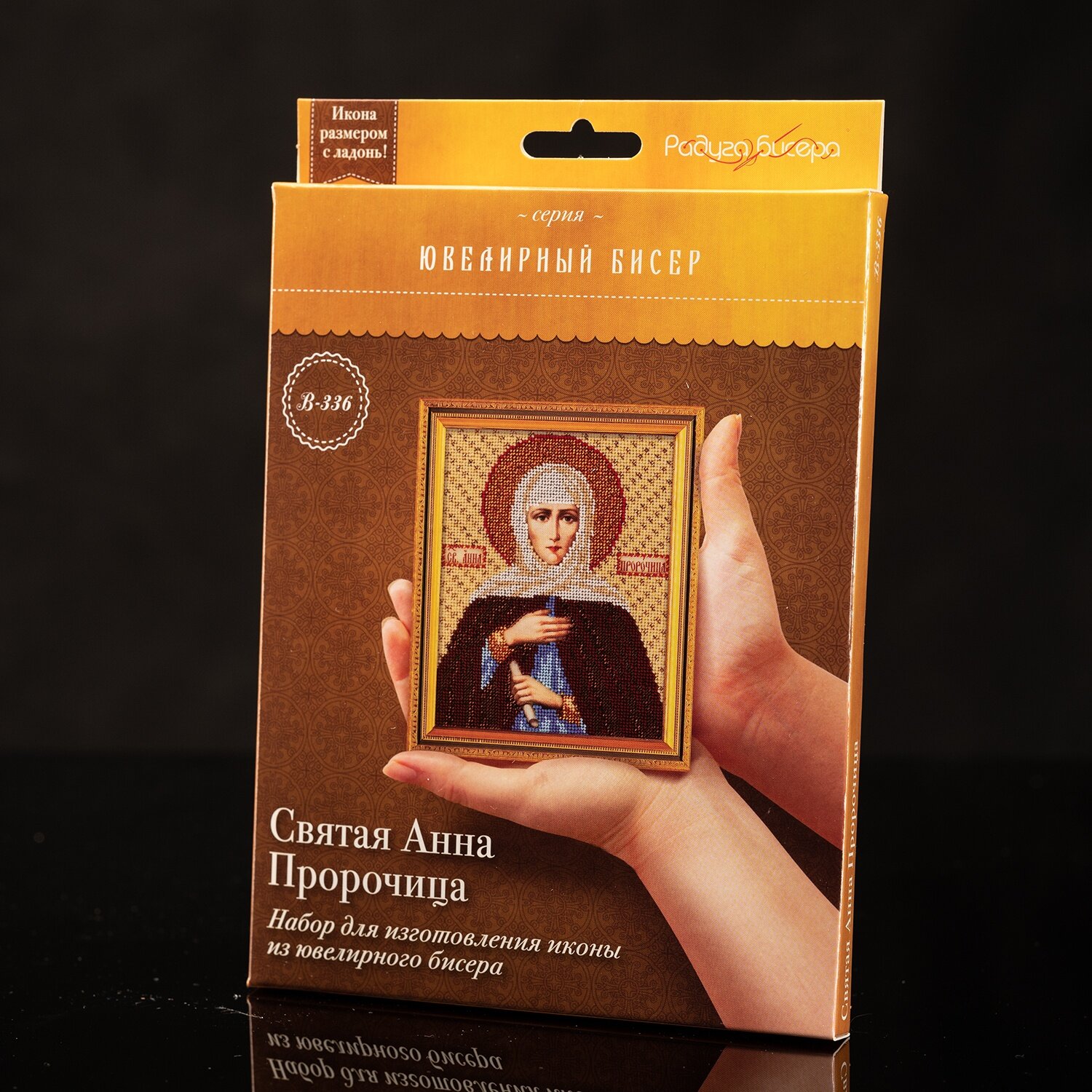 Бисер – традиционный материал для украшения икон. Его ценят за яркий блеск, многообразие цветовой палитры, долговечность. Для вышивания используется ювелирный бисер PRECIOSA ORNELA первого сорта. Он тщательно откалиброван и не имеет бракованных элементов. Ювелирный бисер меньше стандартного, работа с ним потребует особой аккуратности, но результат того стоит. Канва для вышивания изготовлена из натурального материала. Она не деформируется на пяльцах и отлично подходит для оформления в багет. Полимерное покрытие на канве создает эффект живописи и сохраняет изображение от выцветания. Работа выполнена по правилам церковной вышивки: бисером зашиваются отдельные участки, кроме лика, рук и надписей на иконе. Рекомендации: чтобы вышивка получилась аккуратной, используйте пяльцы. Ткань-основу не рекомендуется стирать, поэтому приступать к работе желательно с чистыми руками. Состав набора: льняная канва с фотореалистичным рисунком и схемой; цветная схема и подробные, специально разработанные инструкции; ювелирный бисер; игла для бисера. Нитки для бисера и рамка не входят в комплект. Количество цветов: 11. Время на изготовление: 40 часов.