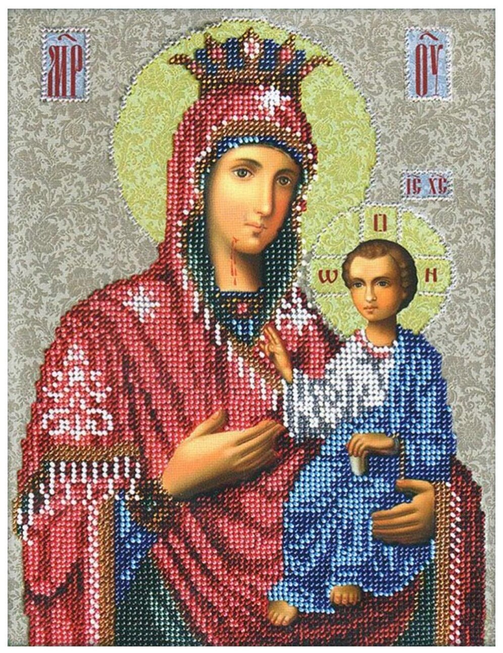 Техника: Вышивка бисером Размер вышивки: 26х20 см. В состав набора входит: бисер (Чехия), льняная основа с нанесенной на нее схемой для вышивания бисером, бисерная игла, инструкция. Паспарту и рамка в комплект не входят. Иверская икона является покровительницей Москвы. История иконы берет свое начало с 9-го столетия. По легенде, во время правления византийского императора Феофила, воины по всему миру отправились истреблять святые иконы. Ворвавшись в дом одной из благочестивой вдове, один из воинов попытался уничтожить лик Богоматери на одной из икон. К общему ужасу, из раны на иконе начало кровоточить. Воин, испугавшись гнева Божьего, пал на колени и стал просить прощения. Вдова же, чтобы спасти икону, решила пустить ее по водам моря, и икона поплыла по волнам. Позже сын вдовы ушел в город Афон, где провел остаток жизни в иноческих подвигах. Именно от него, местные иноки узнали о чуде — иконе плывущей по волнам. Обратите внимание: из-за индивидуальных настроек каждого монитора возможны расхождения в точности передачи цветов.