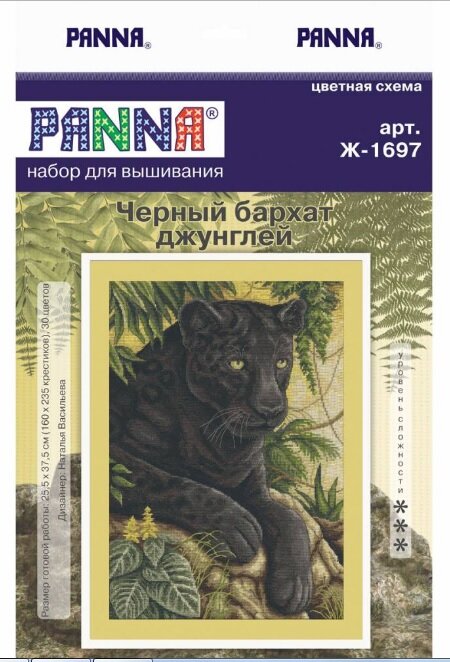 . Набор для вышивания "PANNA" J-1697 "Черный бархат джунглей" В набор для вышивания "PANNA" входит: канва аппретированная "Gamma" К16, хлопчатобумажные нитки мулине "Gamma" на держателе, специализированная игла с тупым концом "Gamma" для вышивания, подробная инструкция по вышиванию и схема.