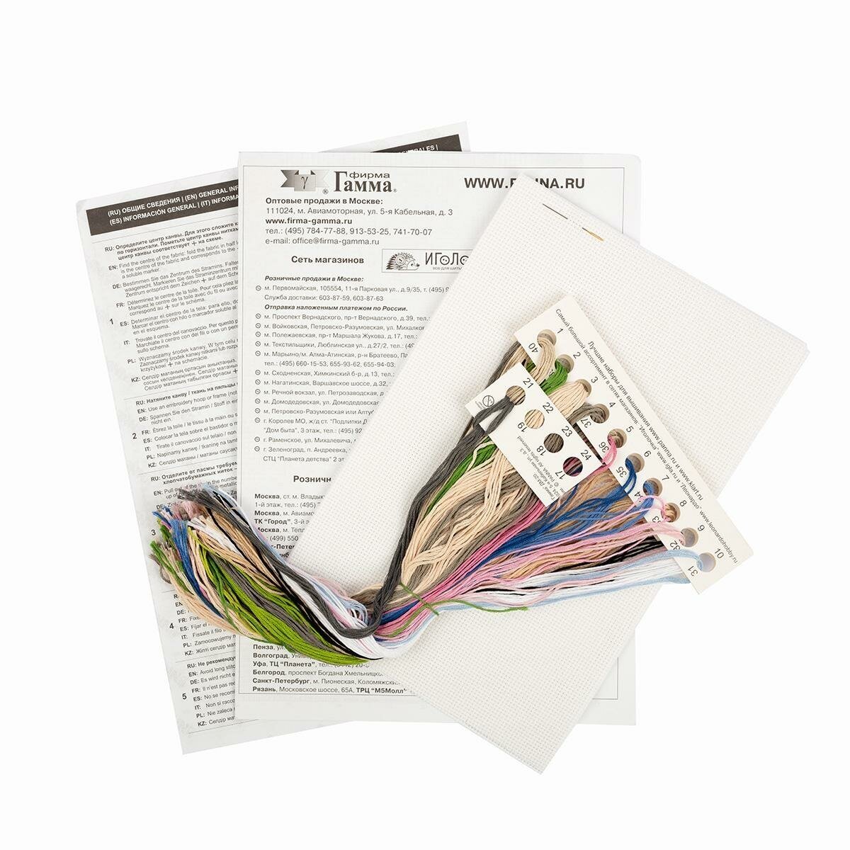 | Комплектация | канва, игла, хлопчатобумажные нитки мулине 24 цвета, черно- белая символьная схема, подробная инструкция на русском языке |