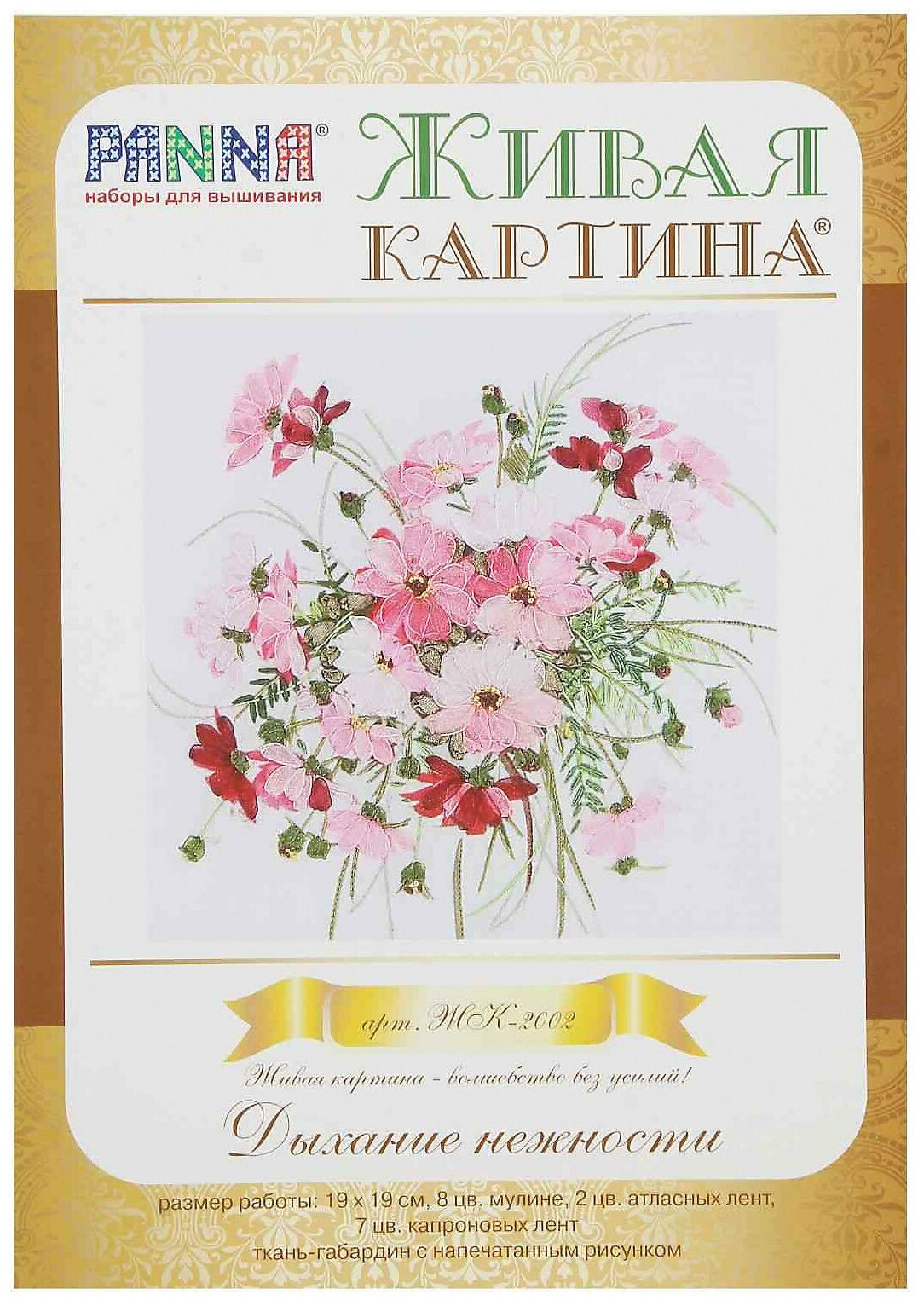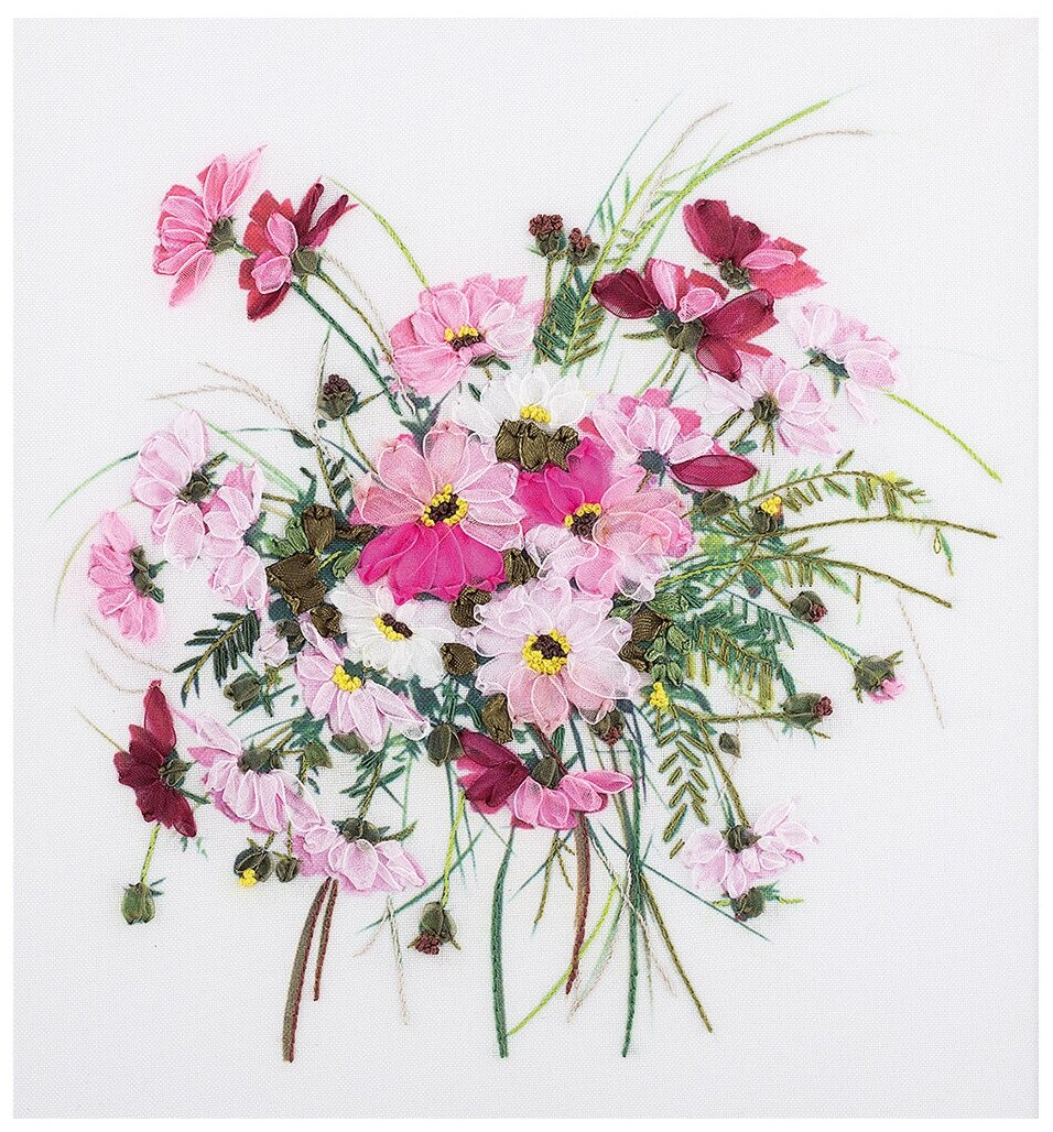 | В набор входит | 8 мулине, 9 капроновых лент, 2 атласных ленты, иглы, ткань с нанесенным рисунком, инструкция с фотографиями |